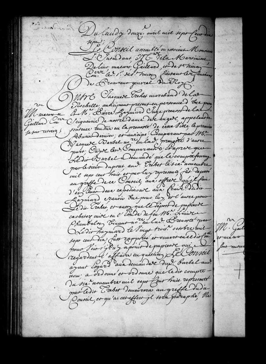 Arrêt qui ordonne au sieur Jacques Trehet, marchand de Larochelle, de produire un compte du sieur Dupont, dans sa cause contre Pierre Haimard, juge prévôt de Notre-Dame-des-Anges, 12 avril 1717, Archives nationales à Québec, Fonds Conseil souverain, (03Q,TP1,S28,P15033).