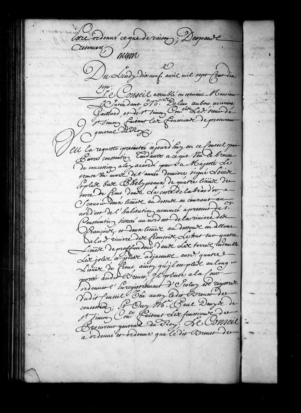 Arrêt qui ordonne d'enregistrer au greffe du Conseil le brevet de concession accordé à Pierre Constantin par Sa Majesté, le 31 mars 1716, «de quatre lieues de terre de front dans la côte de Labrador, savoir deux lieues au dessus de l'habitation du dit Constantin et deux: lieues au-dessous», 19 avril 1717, Archives nationales à Québec, Fonds Conseil souverain, (03Q,TP1,S28,P15036).