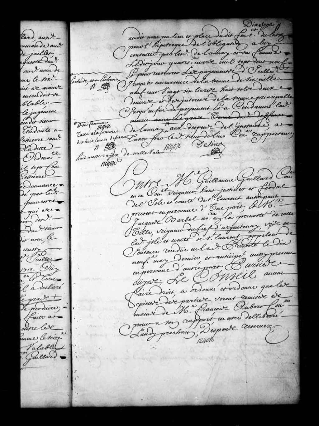 Arrêt qui ordonne de remettre les pièces des parties entre les mains de François Aubert, conseiller, dans la cause de Guillaume Gaillard, seigneur haut justicier et féodal de l'île et comté de Saint-Laurent, contre Jacques Barbel, notaire, seigneur du fief d'Argentenay, appelant de la sentence rendue le 19 mai 1717, 12 juillet 1717, Archives nationales à Québec, Fonds Conseil souverain, (03Q,TP1,S28,P15079).