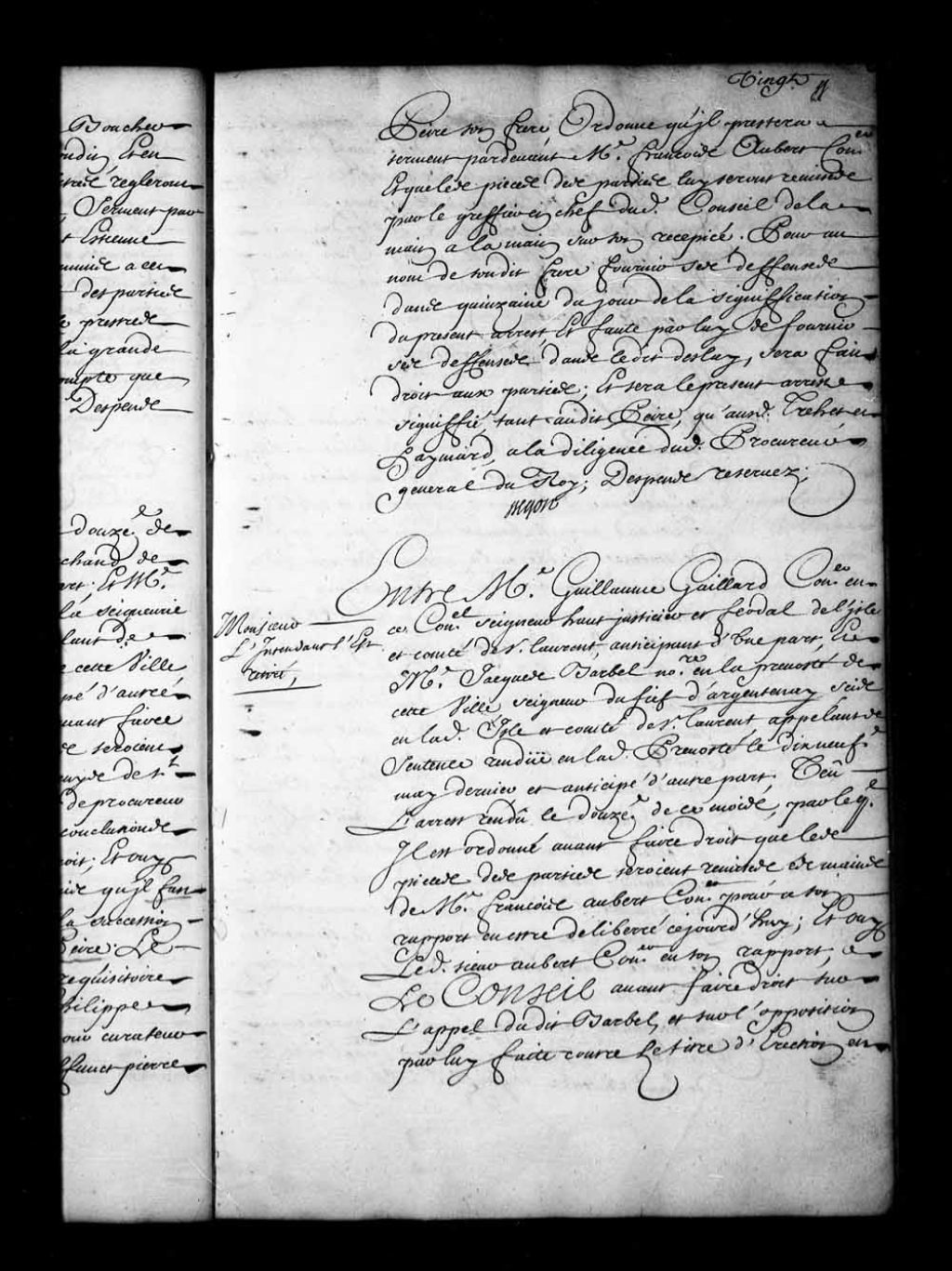 Arrêt qui appointe les parties en droit à servir de griefs dans la cause de Guillaume Gaillard, seigneur haut justicier et féodal de l'île et comté de Saint-Laurent, contre Jacques Barbel, notaire, seigneur du fief d'Argentenay, appelant de la sentence rendue le 19 mai 1717, 19 juillet 1717, Archives nationales à Québec, Fonds Conseil souverain, (03Q,TP1,S28,P15084).