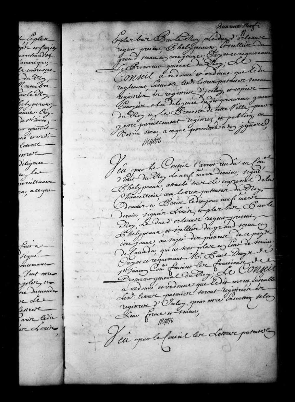 Arrêt qui donne ordre d'enregistrer les lettres patentes du Roi données, au mois de mars 1717, et portant commission à la supérieure des religieuses de l'Hôpital général de Québec de recevoir deux soeurs converses de plus dans cette communauté, 22 novembre 1717, Archives nationales à Québec, Fonds Conseil souverain, (03Q,TP1,S28,P15123).