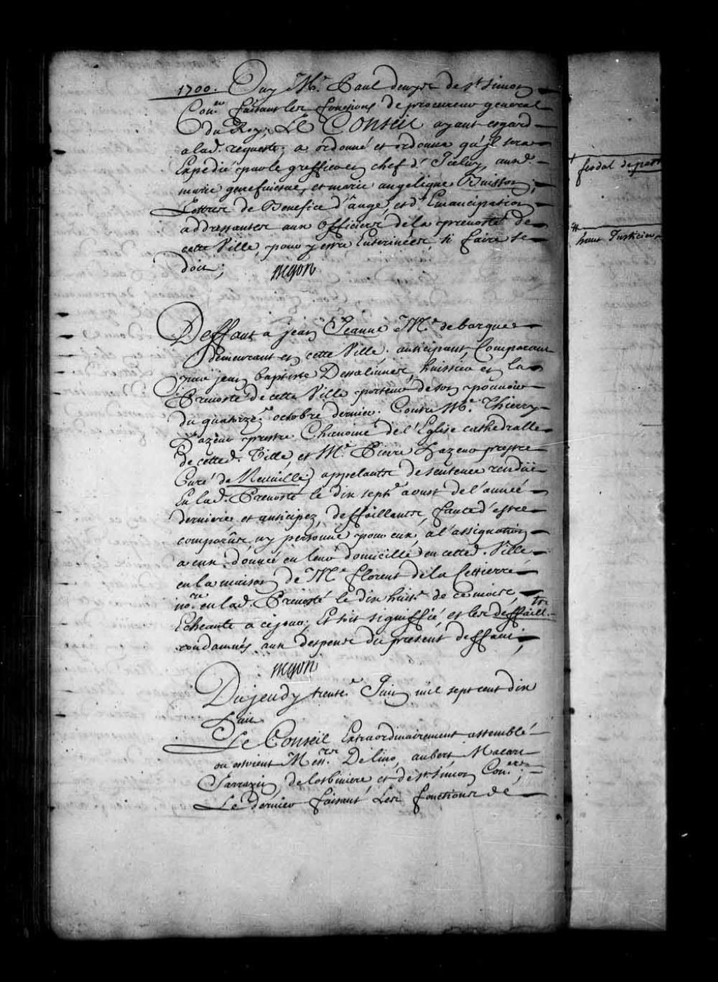 Sentence, du 19 mai 1717, mise à néant dans la cause de Guillaume Gaillard, conseiller, seigneur féodal de l'île et comté de Saint-Laurent, contre Jacques Barbel, notaire, seigneur haut justicier du fief d'Argentenay. Le Conseil a donné mainlevée au dit appelant de la saisie faite à la requête du sieur Gaillard des revenus de la seigneurie d'Argentenay, le 19 octobre 1716. Ordonne que l'appelant portera foi et hommage à Château-Richer, en la seigneurie de Beaupré, ainsi qu'il est dit par son titre de concession du 23 juillet 1652, 30 juin 1718, Archives nationales à Québec, Fonds Conseil souverain, (03Q,TP1,S28,P15182).