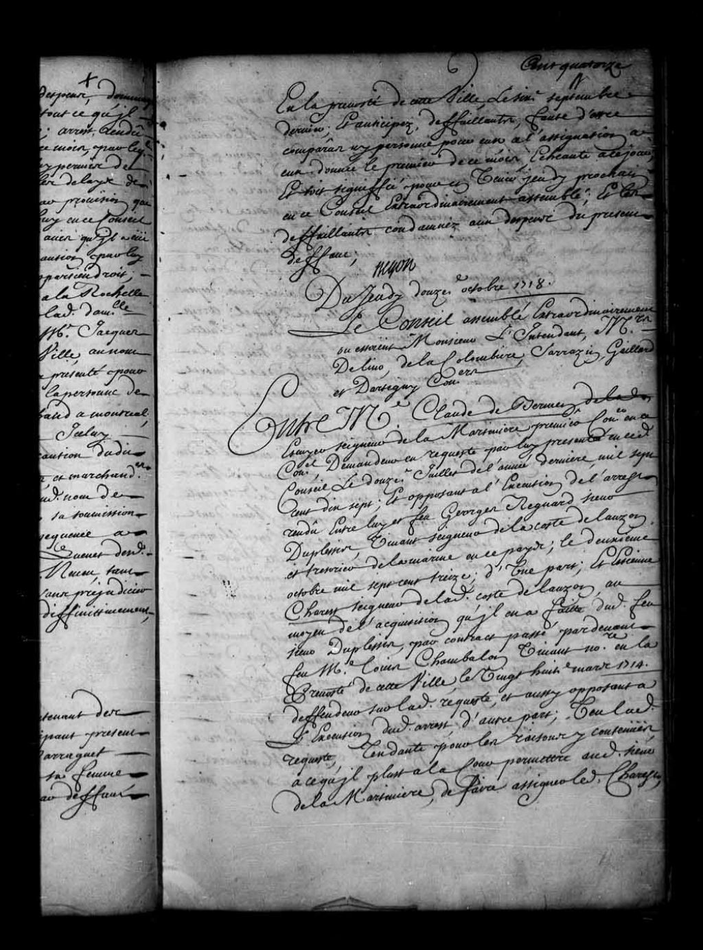 Sentence mise à néant dans la cause de Claude de Bermen, sieur de la Martinière, premier conseiller au Conseil Supérieur, contre Etienne Charest, seigneur de Lauzon; le sieur de la Martinière, ses hoirs et ayant cause remis en pleine possession et jouissance du fief et seigneurie de Lauzon, suivant et conformément au procès-verbal d'arpentage de la côte de Lauzon faite par Jean Le Rouge, arpenteur, le 10 octobre 1694, 12 octobre 1718, Archives nationales à Québec, Fonds Conseil souverain, (03Q,TP1,S28,P15221).