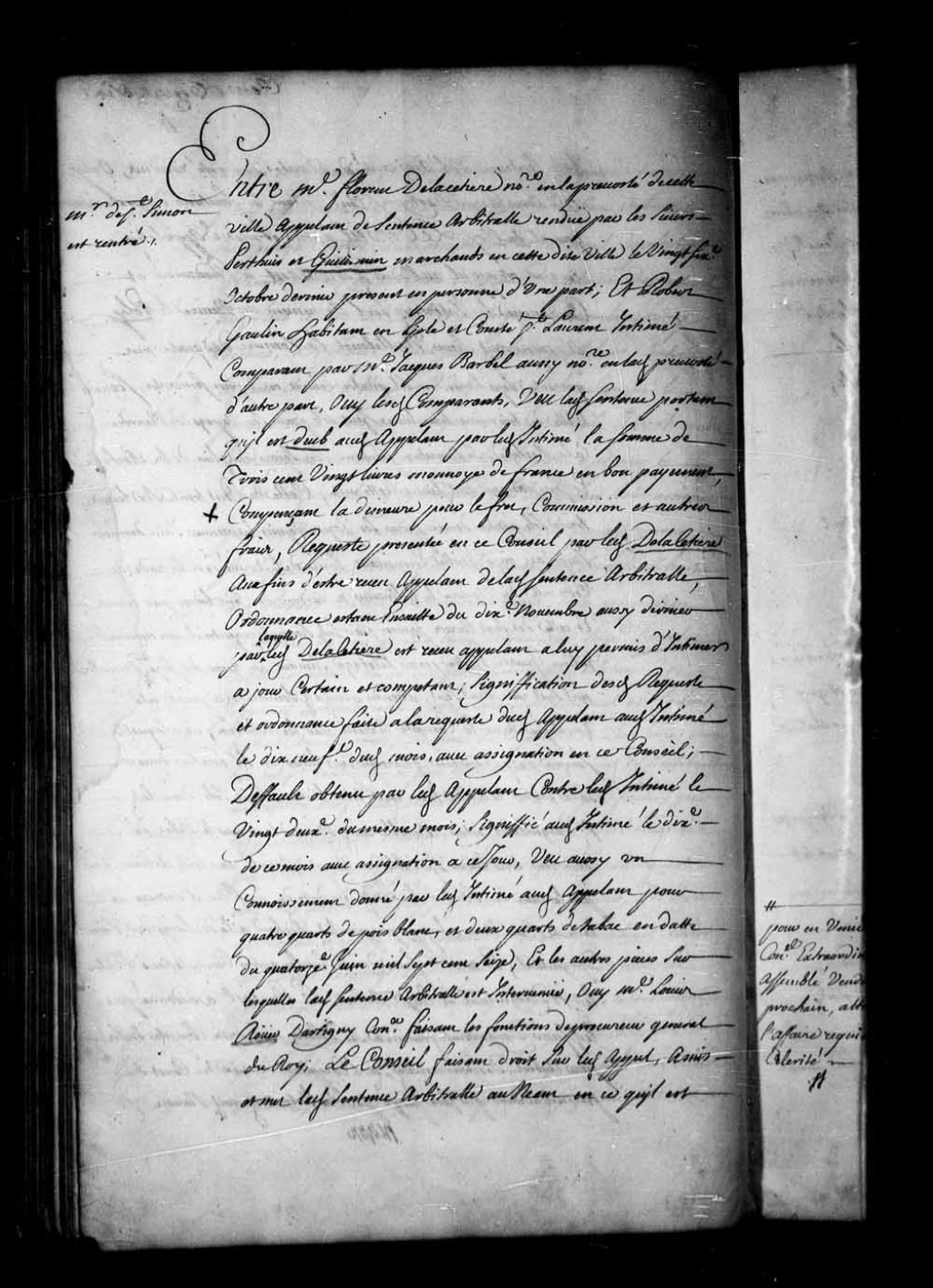 Sentence arbitrale rendue par les sieurs Perthuis et Guillemin mise à néant dans la cause de Florent de LaCetière contre Robert Gaulin, habitant de l'île et comté de Saint-Laurent; Ce dernier est condamné à payer à LaCetière la somme de 320 livres, 19 décembre 1718, Archives nationales à Québec, Fonds Conseil souverain, (03Q,TP1,S28,P15240).
