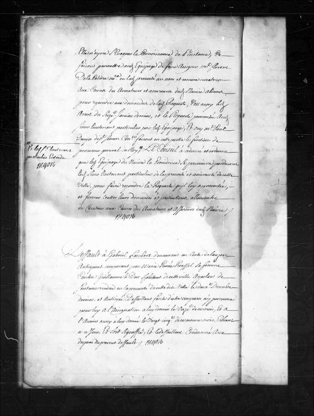 Défaut à Gabriel Lambert, demeurant en la côte de Lauzon, comparant par Marie-Renée Roussel, sa femme, contre Guillaume Leduc, habitant, de Québec
