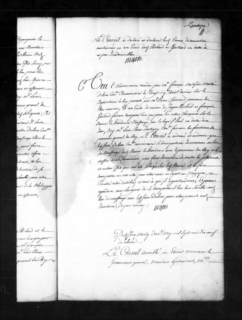 Arrêt qui ordonne au sieur François-Mathieu Martin de Lino, conseiller commissaire, de se transporter incessamment au lieu du naufrage de la Providence pour faire inventaire de toutes les pelleteries et autres effets qui ont été chargés sur le dit navire