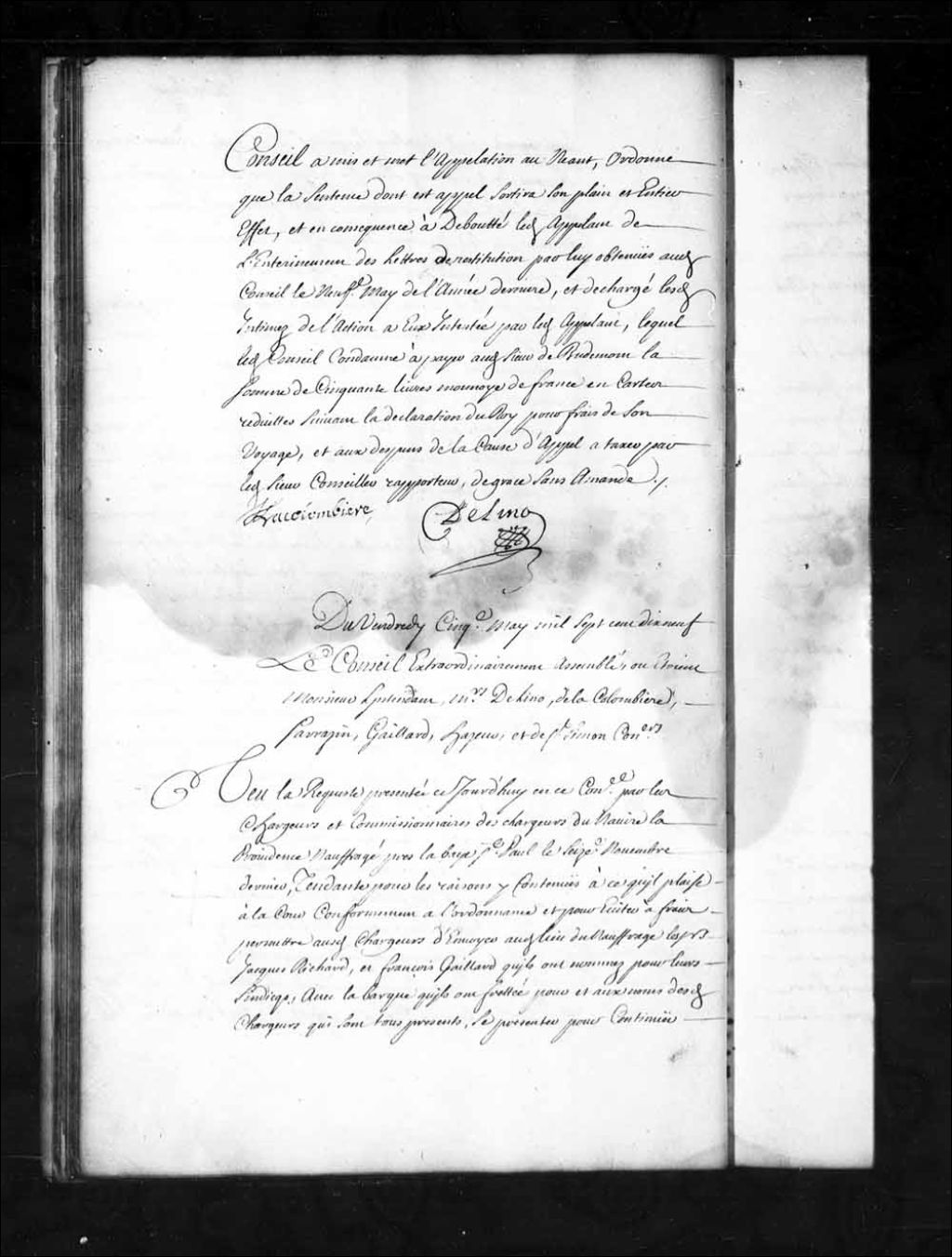 Arrêt qui nomme Jacques Barbel, juge bailli de la côte de Beaupré, pour se transporter au lieu du naufrage de «La Providence et faire inventaire à la place de François-Mathieu Martin de Lino; il est permis aux sieurs Richard et Gaillard de prêter un ou plusieurs bâtiments et de faire les dépenses nécessaires tant pour le paiement du fret que pour celui des autres dépenses pour raison du naufrage de «La Providence», 5 mai 1719, Archives nationales à Québec, Fonds Conseil souverain, (03Q,TP1,S28,P15283).