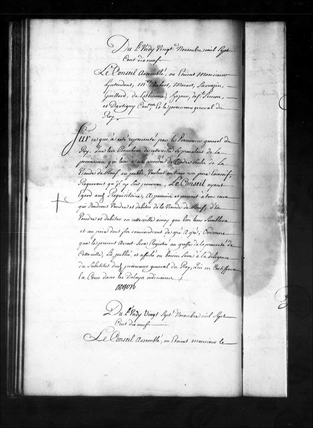Sur la représentation du procureur général du Roi que les bouchers de Québec se prévalant de la permission qui leur a été accordée de vendre seuls de la viande de boeuf en public. Le Conseil permet à tous ceux qui voudront vendre et débiter de la viande de boeuf, d'en vendre à Québec et au prix dont ils conviendront de gré à gré