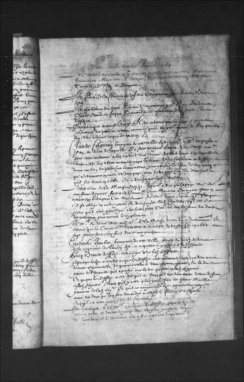 - Transcription du texte avec orthographe modernisée : «Eustache LAMBERT bourgeois de cette ville fermier des droits du domaine de la seigneurie de Lauson demandeur et requérant le profit d'un défaut. Henri BRAULT défendeur réassigné sur ledit défaut après que le demandeur a conclu à ce que le défendeur soit condamné lui payer deux années de rente seigneuriale de quarante sols et deux chapons chacune, et la dixième partie de l'anguille qu'il a pêchée sur la terre qu'il tient en ladite seigneurie. Et que par le défendeur a été dit qu'il est vrai qu'il tient deux arpents de terre de front en ladite seigneurie mais qu'il y a été placé par le fils de Pierre Miville procureur de ladite seigneurie et qu'il ne reconnaît le demandeur ayant même payé une année des deux qui lui sont demandées à Michel Fillion et à Charles (...) Et qu'il n'a encore aucun titre de concession. Parties ouïes, le Conseil a condamné le défendeur payer au demandeur (¿) mêmes recettes et droits de pêche dont ses plus prochains voisins (¿) leurs terre et concessions et à faire apparaître de quittance (¿)»