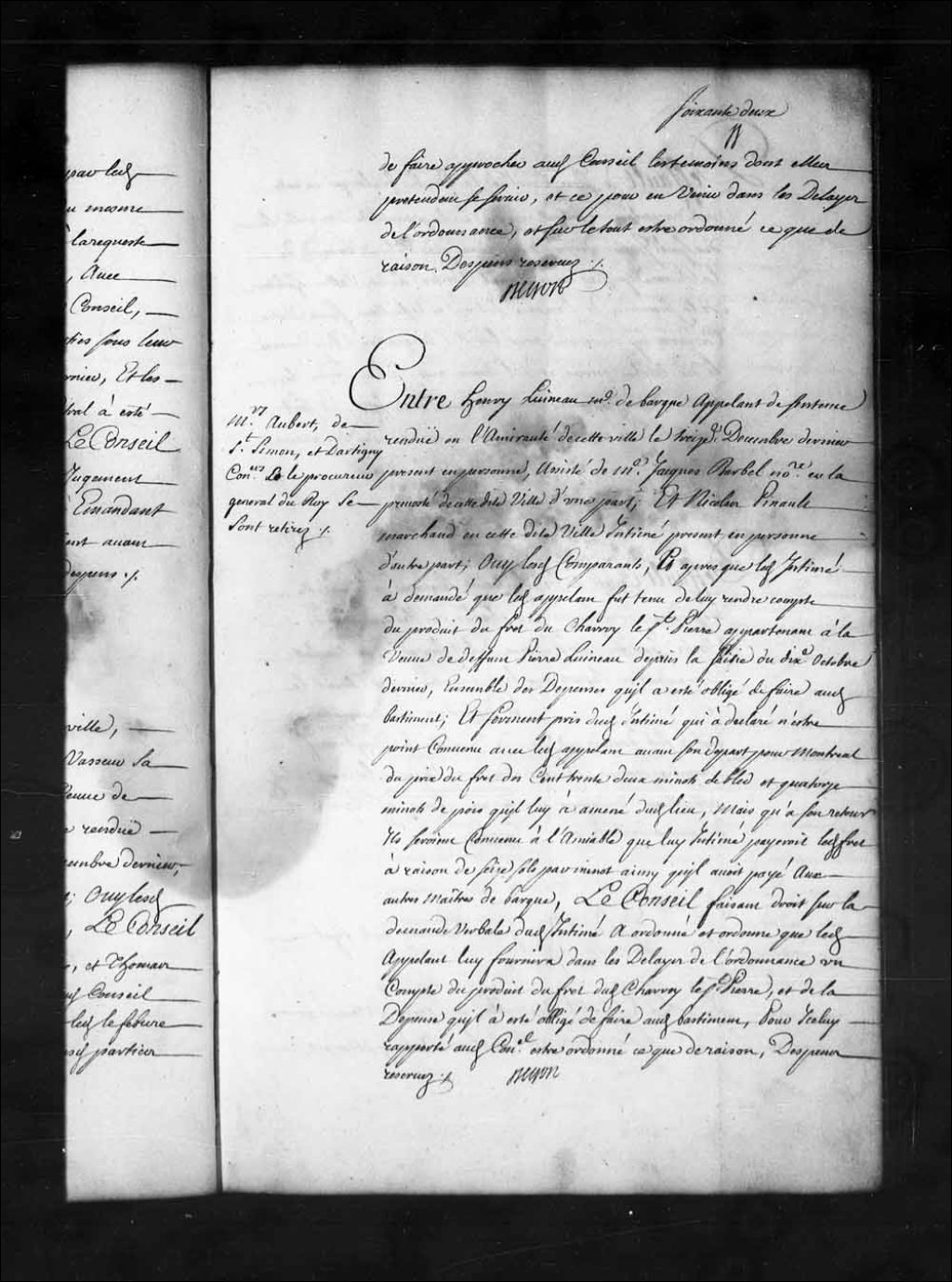 Arrêt qui ordonne à Henri Luineau, maître de barque et appelant de la sentence rendue le 16 décembre 1719, de fournir à Nicolas Pinault, marchand à Québec, un compte du produit du fret du charroi le Saint-Pierre, propriété de la veuve de Pierre Luineau