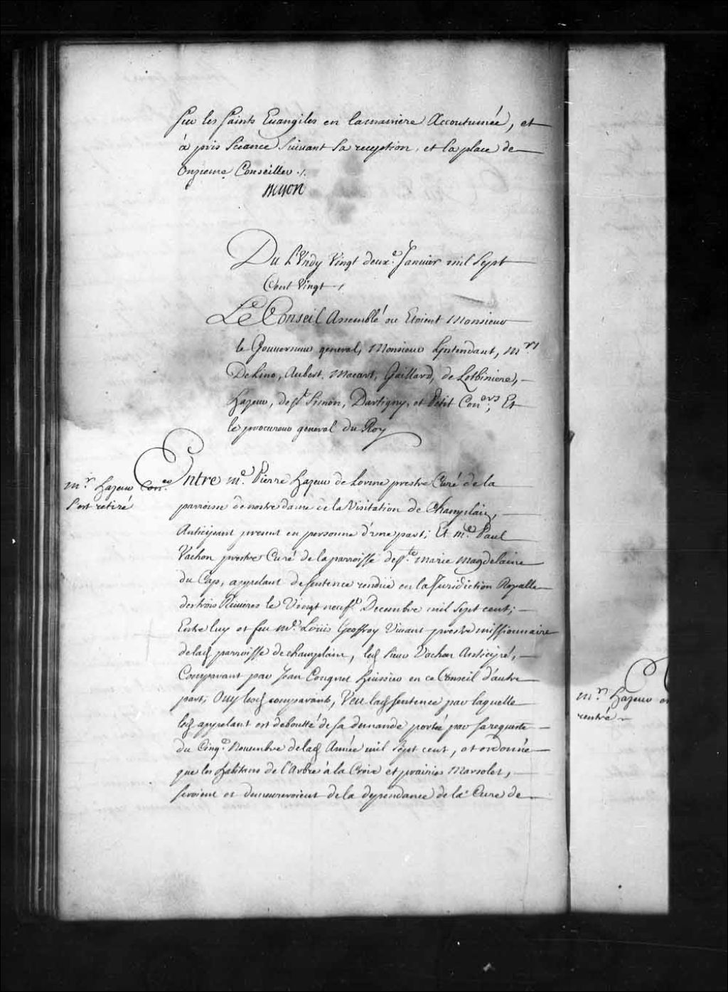 Appel mis à néant dans la cause de M. Pierre Hazeur Delorme, prêtre, curé de la paroisse de Notre-Dame-de-la-Visitation-de-Champlain, contre M. Paul Vachon, prêtre, curé de Sainte-Marie-Madeleine-du-Cap. (Le jugement de la Juridiction de Trois-Rivières, du 22 décembre 1700, confirmé par le Conseil Supérieur, le 22 janvier 1720, ordonnait que les habitants de l'Arbre-à-la-Croix et Prairies-Marsolet seraient et demeureraient de la dépendance du curé de Champlain et y payeraient les dîmes ainsi qu'ils avaient fait par le passé), 22 janvier 1720, Archives nationales à Québec, Fonds Conseil souverain, (03Q,TP1,S28,P15368).