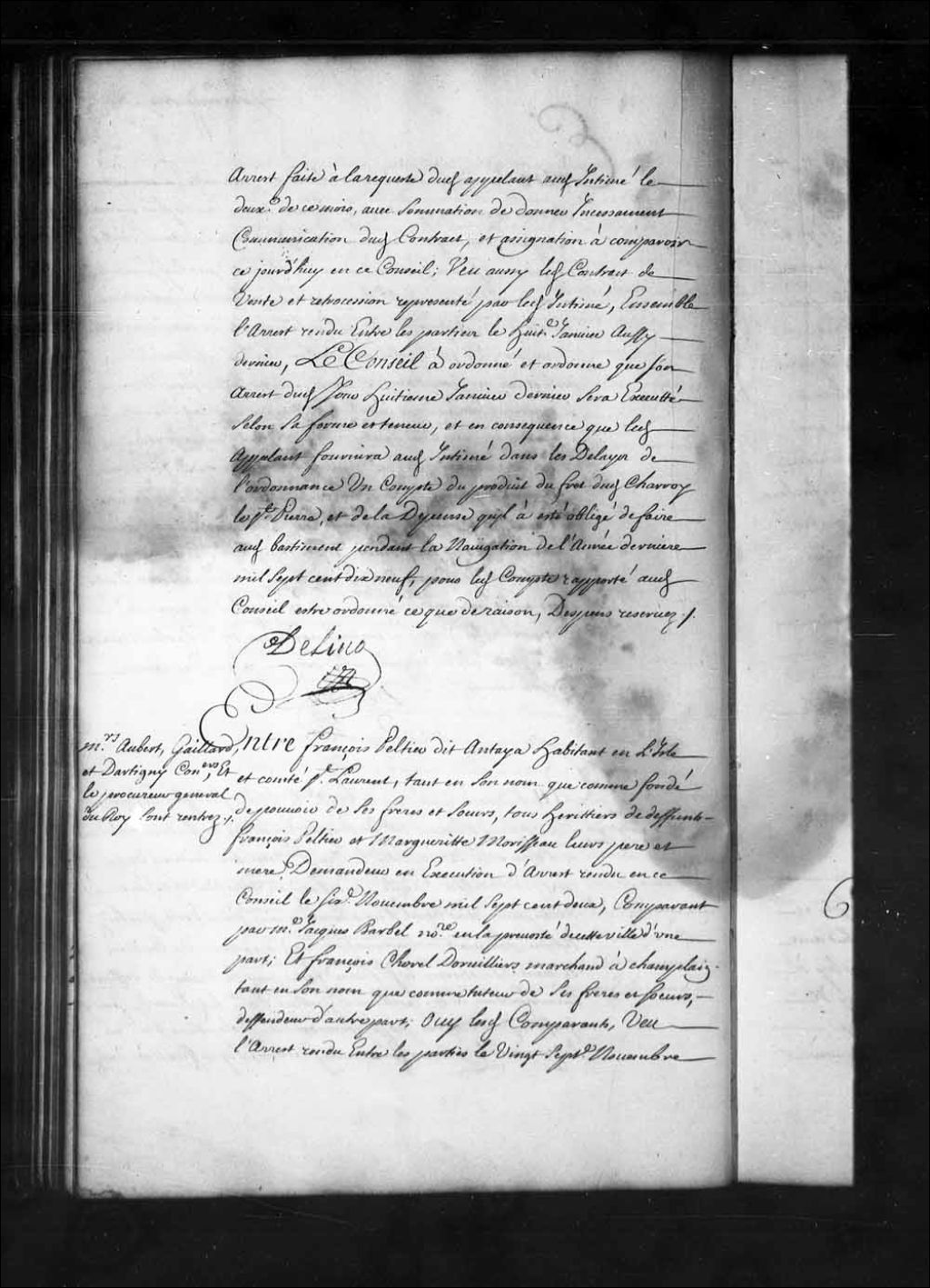 Arrêt qui ordonne à Eustache Chartier de Lotbinière, conseiller rapporteur dans la cause de François Chorel Dorvilliers contre François Pelletier dit Antaya, de remettre au dit Chorel Dorvilliers, sur son récépissé, les pièces qu'il a produites entre ses mains pour le mettre en état de répondre à sa requête du 27 février 1719, 11 mars 1720, Archives nationales à Québec, Fonds Conseil souverain, (03Q,TP1,S28,P15388).