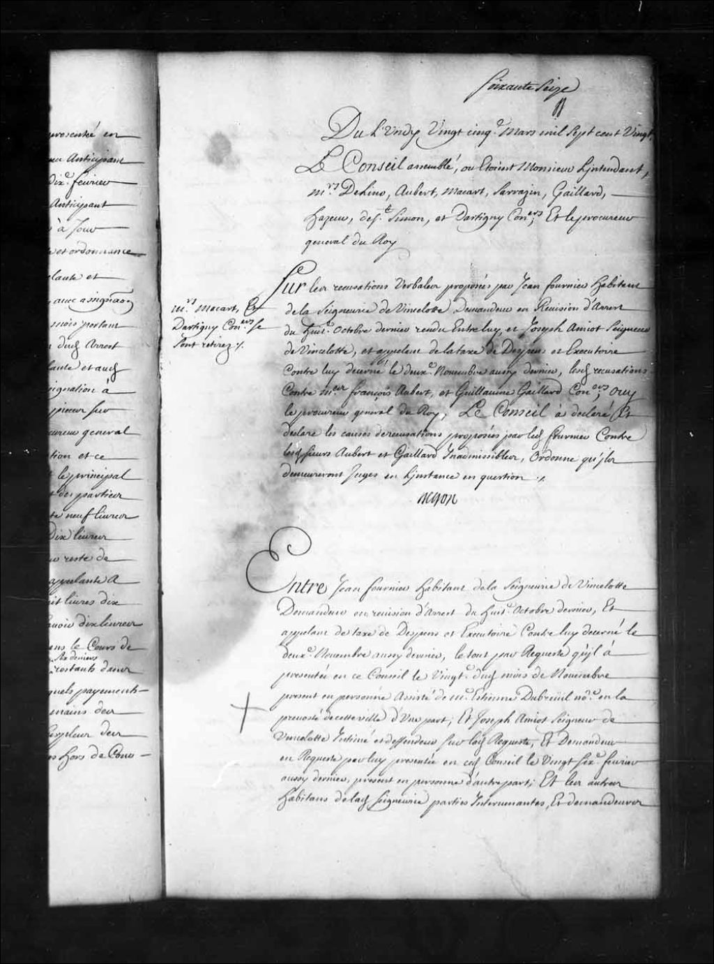 Arrêt qui donne ordre à Paul Denys de Saint-Simon, conseiller, de se transporter, aussitôt que la navigation sera libre en la seigneurie de Vincelotte, en présence du sieur Amyot Vincelotte, de Jean Fournier et de tous autres habitants du dit lieu qu'il fera avertir à cet effet par le capitaine de la côte, faire prendre quatre minots de blé, les faire transporter au moulin seigneurial et les faire moudre en leur présence en farine propre pour les habitants, et de la dite farine en être apportée en ce conseil une poche de deux minots après avoir été cachetée dans le moulin en présence des parties; pour ensuite être ordonné ce que de raison dans la cause de Jean Fournier contre Joseph Amyot, 25 mars 1720, Archives nationales à Québec, Fonds Conseil souverain, (03Q,TP1,S28,P15393).
