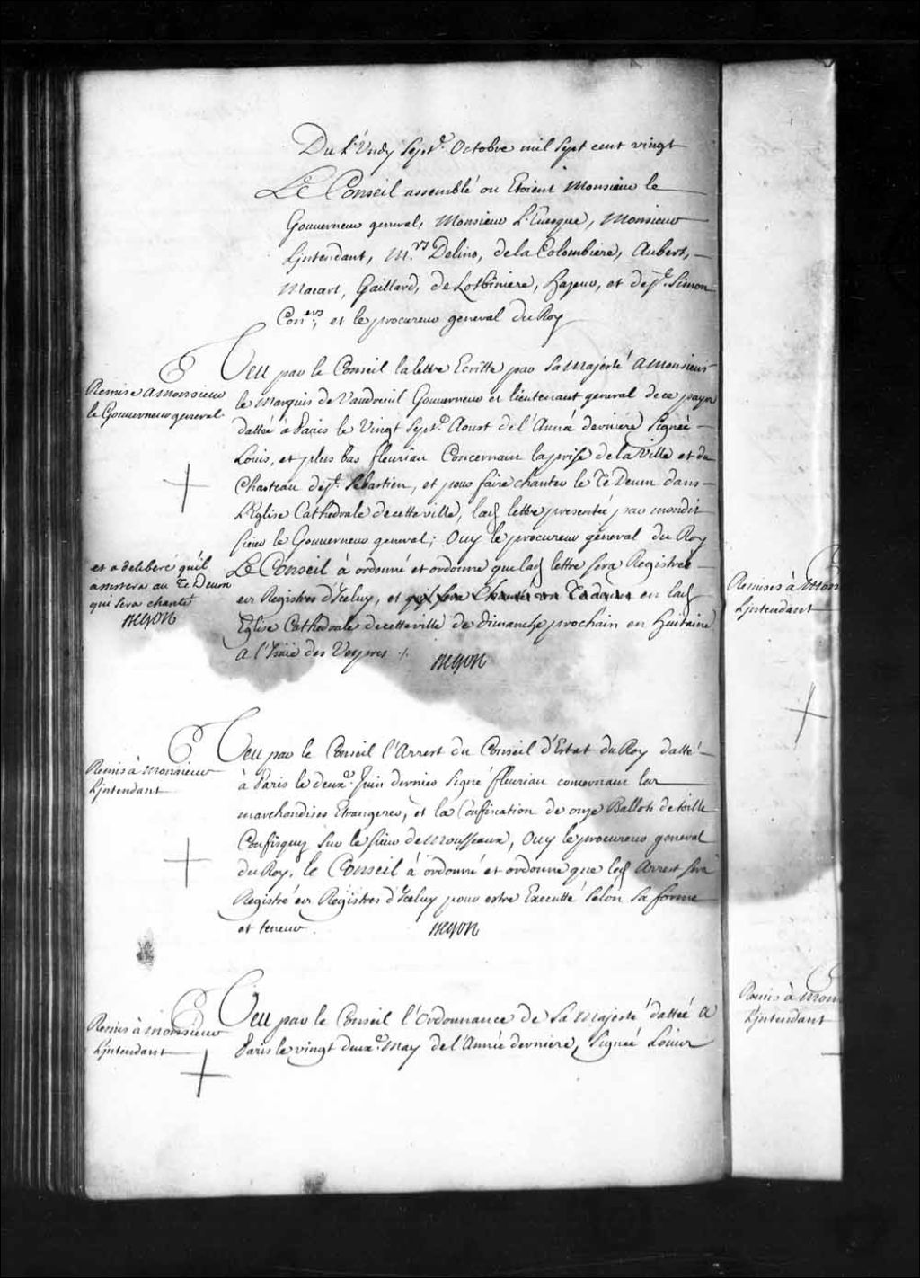 Arrêt qui ordonne d'enregistrer la lettre de Sa Majesté au marquis de Vaudreuil, gouverneur et lieutenant général de ce pays, datée à Paris le 27 août 1719, concernant la prise de la ville et du château de Saint-Sébastien; et pour faire chanter le Te Deum dans l'Église cathédrale de Québec. Le Conseil assistera au Te Deum qui sera chanté dans l'église
