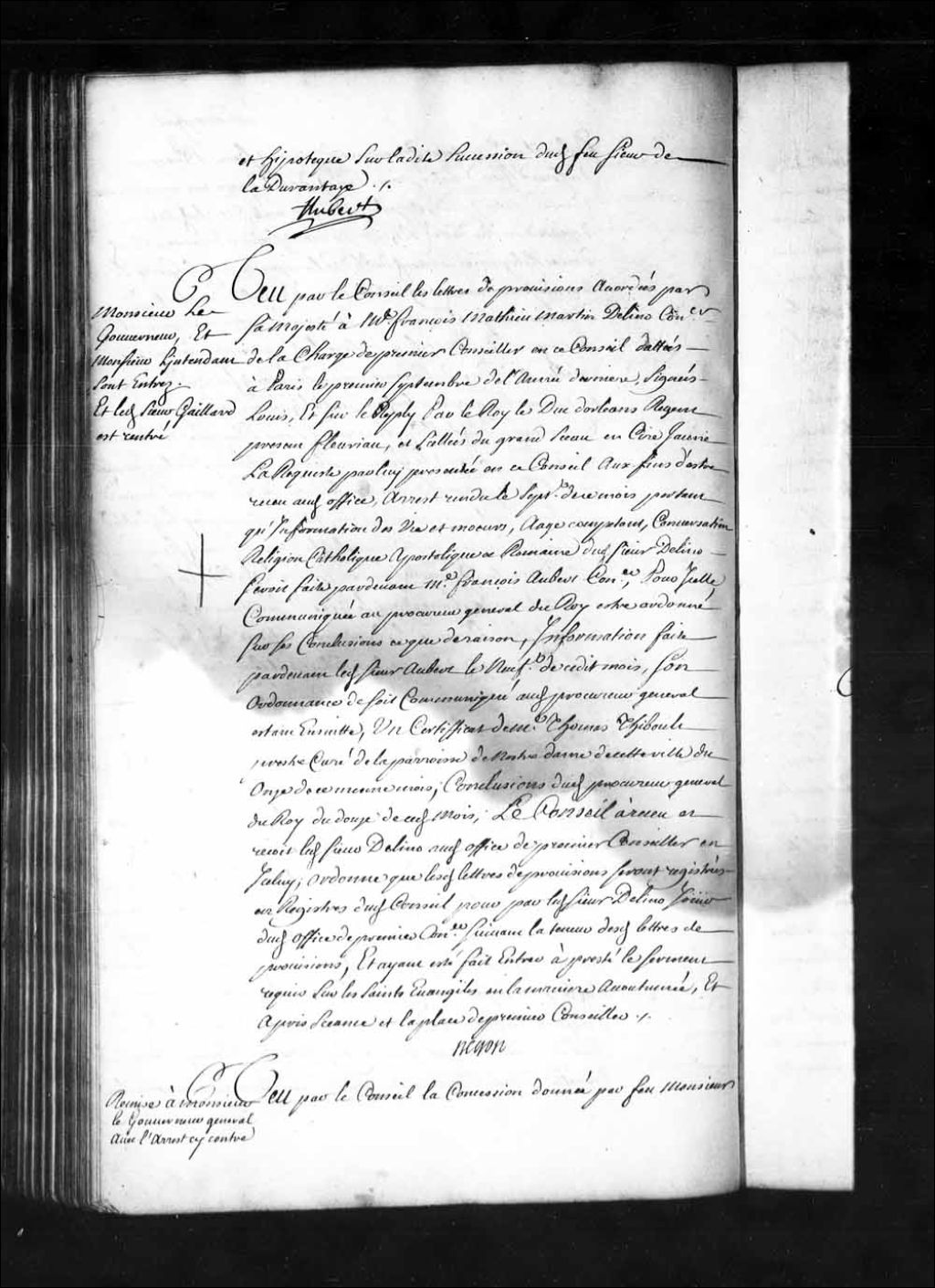Arrêt qui ordonne d'enregistrer la concession donnée au marquis de Vaudreuil par feu le chevalier de Callières et M. de Beauharnois, pour lors gouverneur et intendant, le 23 octobre 1702, de la moitié d'une langue de terre située au lieu dit la Pointe aux Tourtres (Tourtes)