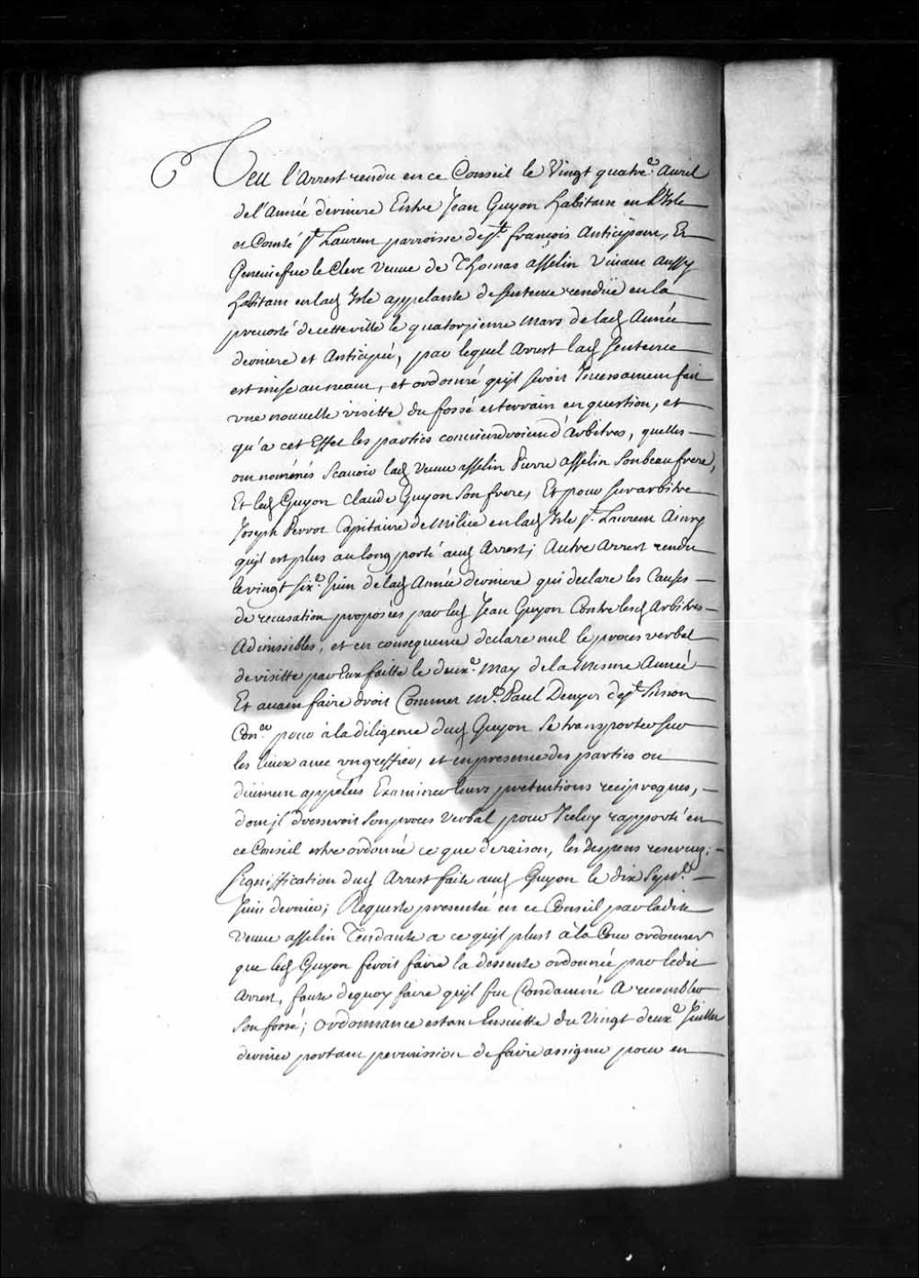 Arrêt qui donne ordre à Jean Guyon, habitant de l'île et comté de Saint-Laurent, de faire à ses frais et dépenses un fossé depuis le bas du marais qui est sur sa terre jusqu'à la ligne de séparation d'entre lui et Geneviève Leclerc, veuve de Thomas Asselin. Guyon doit continue le fossé dans la ligne de séparation jusqu'au ruisseau qui est sur la terre de la dite veuve Asselin