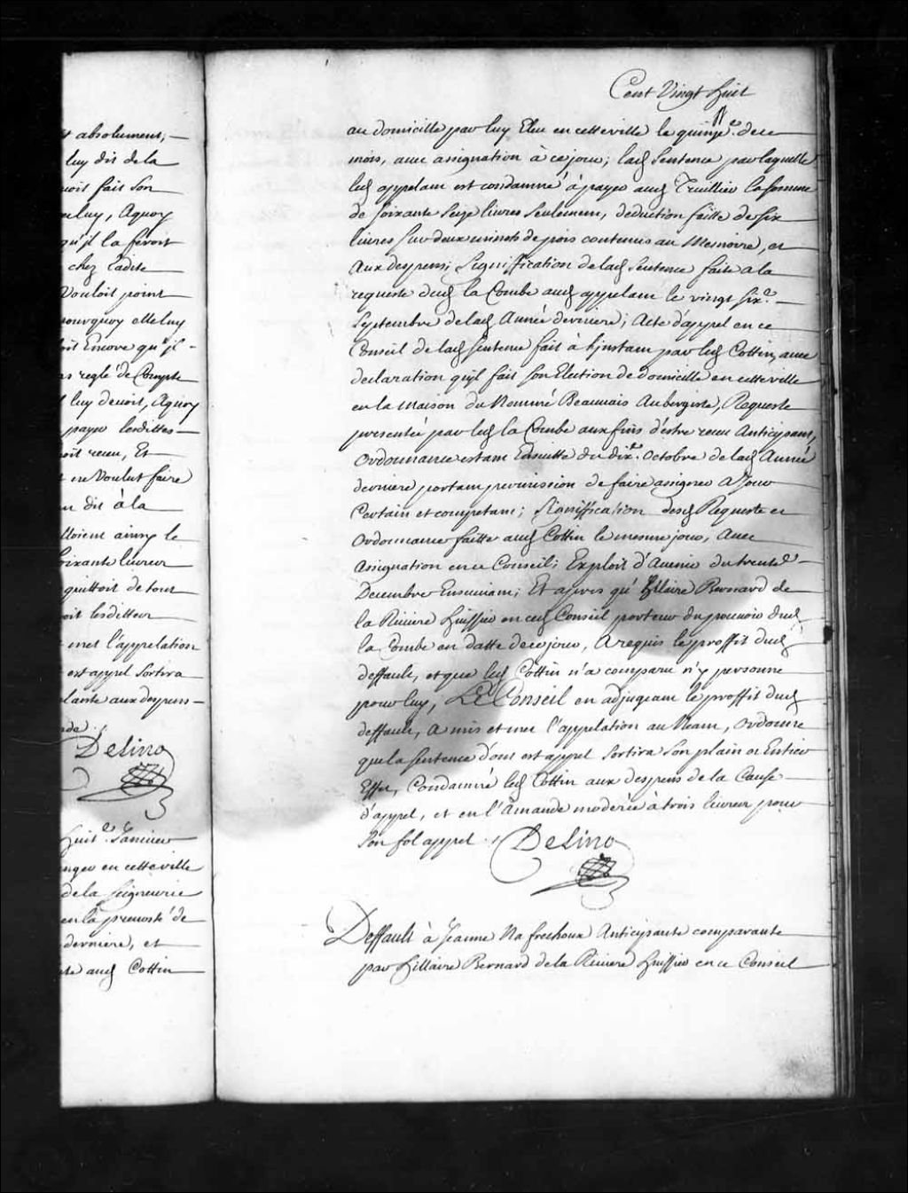 Défaut à Jeanne Nafrechoux, contre Jacques Leber de Senneville, capitaine d'une compagnie des troupes du détachement de la Marine, 25 novembre 1720, Archives nationales à Québec, Fonds Conseil souverain, (03Q,TP1,S28,P15502).