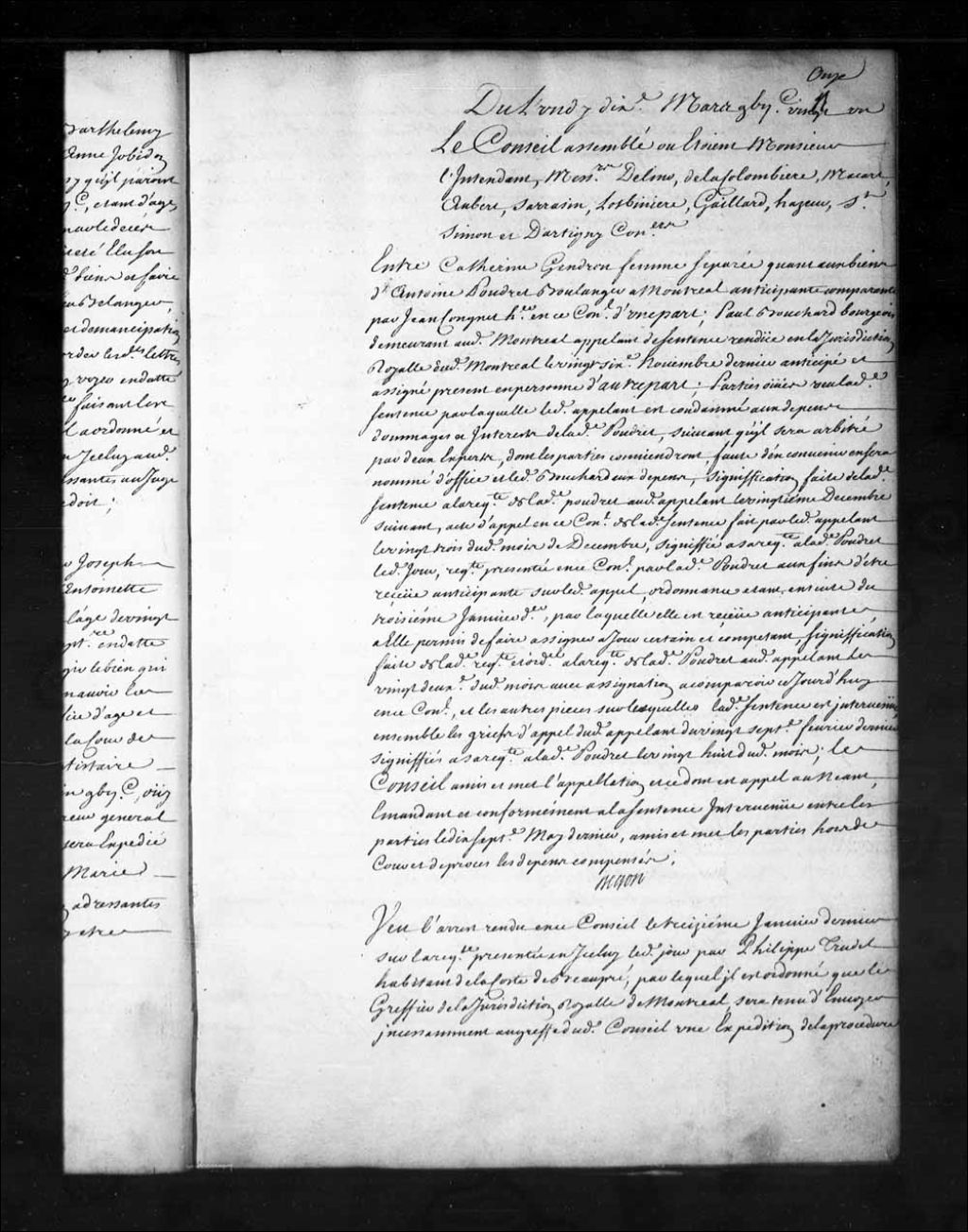 Ordonné, avant de faire droit, qu'il sera délibéré et à cet effet que la procédure sera remise entre les mains de Charles Macart, conseiller, dans l'affaire de Philippe Trudel, habitant de la côte de Beaupré, au sujet de l'arrêt, rendu le 13 janvier 1721, qui ordonne au greffier de la Juridiction de Montréal d'envoyer incessamment au greffe du dit Conseil Supérieur une expédition de la procédure énoncée en une certaine requête du dit Trudel, 10 mars 1721, Archives nationales à Québec, Fonds Conseil souverain, (03Q,TP1,S28,P15551).