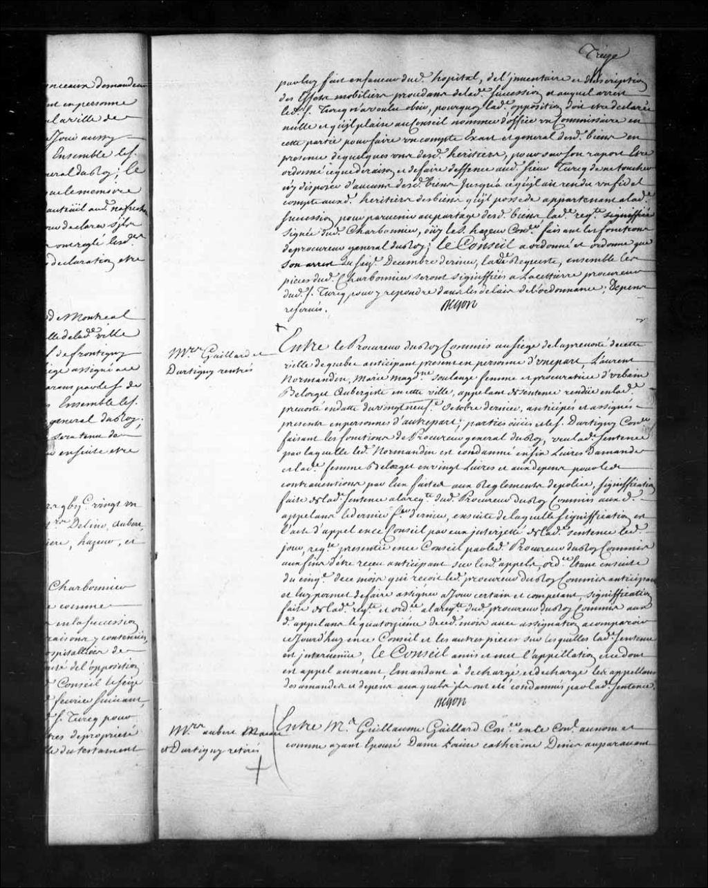 Arrêt qui accorde délai jusqu'au mois d'octobre de l'année prochaine (1722) pour faire venir, de Larochelle à Québec, les pièces justificatives du compte en contestation dans la cause de Guillaume Gaillard, conseiller, comme époux de Louise-Catherine Denys, auparavant veuve de Dominique Bergeron, et tutrice de ses enfants, et comme procureur de François Poisset, des enfants du premier lit du sieur Bergeron et de Marie-Anne Millot, contre Charles Fleury, marchand de Larochelle, 24 mars 1721, Archives nationales à Québec, Fonds Conseil souverain, (03Q,TP1,S28,P15560).