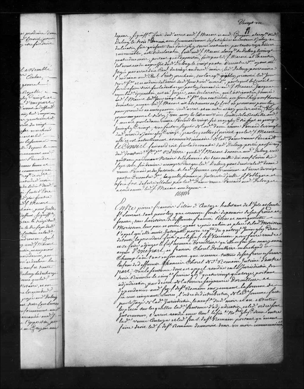 Sentence d'adjudication mise à néant dans la cause de François Pelletier dit Antaya, fondé de pouvoir de ses frères et soeurs, contre François Chorel Dorvilliers, tuteur de ses frères et soeurs, au sujet d'une terre située dans la seigneurie Dorvilliers, 28 avril 1721, Archives nationales à Québec, Fonds Conseil souverain, (03Q,TP1,S28,P15582).