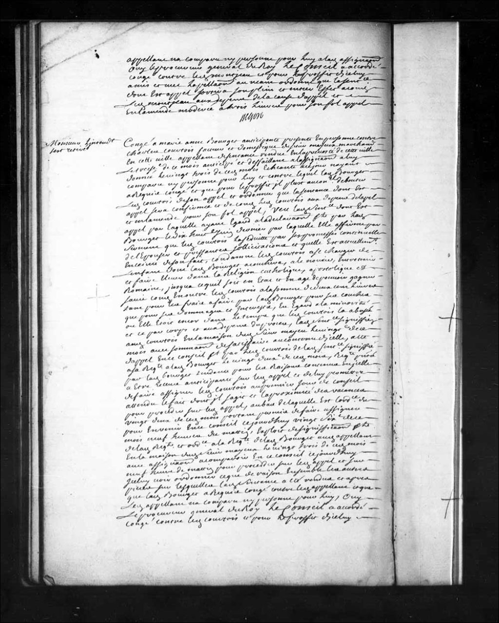 Appel mis à néant de la sentence rendue, le 13 août 1721, dans la cause de Marie-Anne Bourget contre Charles Comtois, facteur et domestique du sieur Mayeux, marchand de Québec. Comtois est condamné à se charger de l'enfant dont la dite Marie-Anne Bourget accouchera et congé est accordé à Marie-Anne Bourget, 26 août 1721, Archives nationales à Québec, Fonds Conseil souverain, (03Q,TP1,S28,P15644).