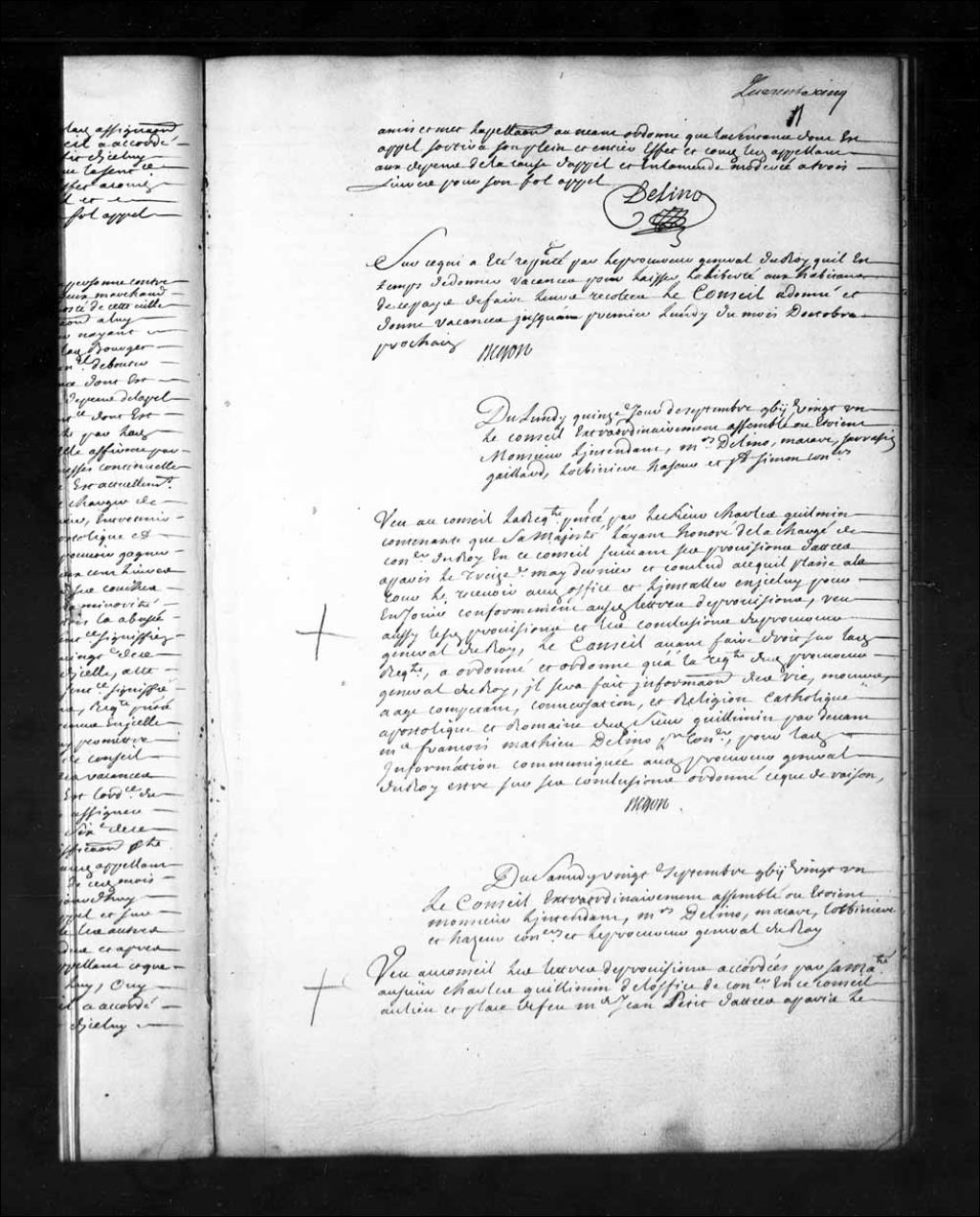 Réception de Charles Guillimin au Conseil Supérieur: «ayant été fait entré a prêté le serment requis sur les Saints Évangiles en la manière accoutumée et a pris séance suivant sa réception, et la place de onzième conseiller», 20 septembre 1721, Archives nationales à Québec, Fonds Conseil souverain, (03Q,TP1,S28,P15647).