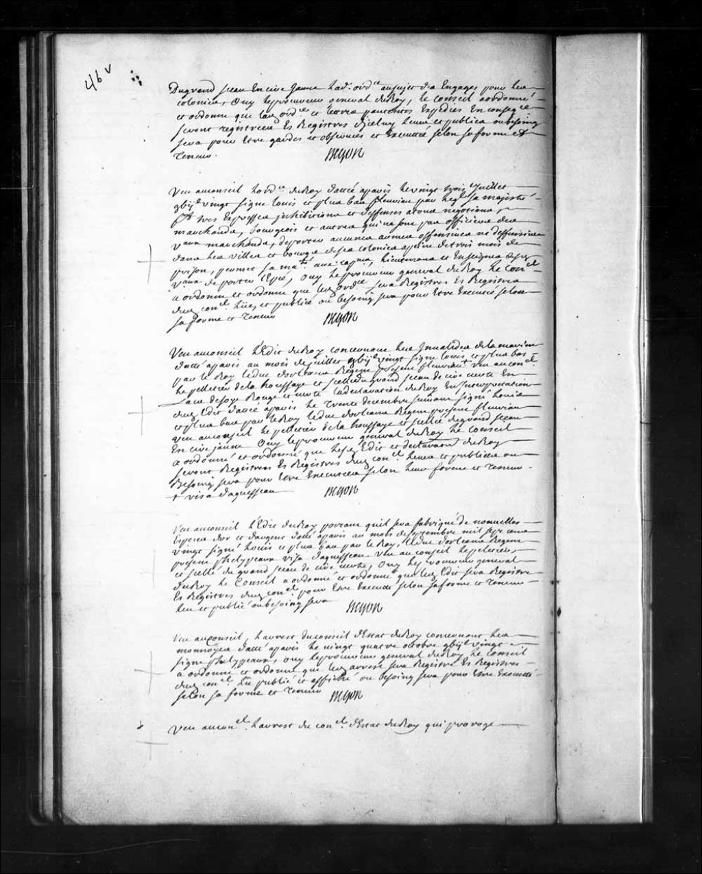 Arrêt qui ordonne d'enregistrer l'ordonnance du Roi, datée à Paris le 23 juillet 1720, qui fait très expresses inhibitions et défenses à tous négociants, marchands, bourgeois et autres qui ne sont pas officiers des vaisseaux marchands de porter aucune arme offensive ou défensive dans les villes et bourgs de ses colonies, à peine de trois mois de prison; permet Sa Majesté aux capitaines, lieutenants et enseignes des dits vaisseaux de porter l'épée, 23 septembre 1721, Archives nationales à Québec, Fonds Conseil souverain, (03Q,TP1,S28,P15653).