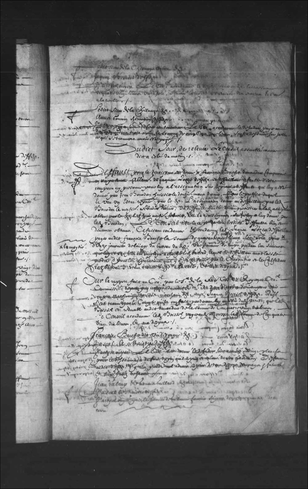 Transcription du texte avec orthographe modernisée : «François Boucher dit VIN D'ESPAGNE demandeur. Pascal LEMAISTRE défendeur. Parties ouïes, le Conseil a condamné le défendeur livrer au demandeur vingt planches pour le dédommager du bois de pin qu'il a pris et enlevé de son habitation. Défenses audit défendeur d'y rien prendre à l'avenir à peine de tous dépens dommages et intérêts et aux frais de justice.»