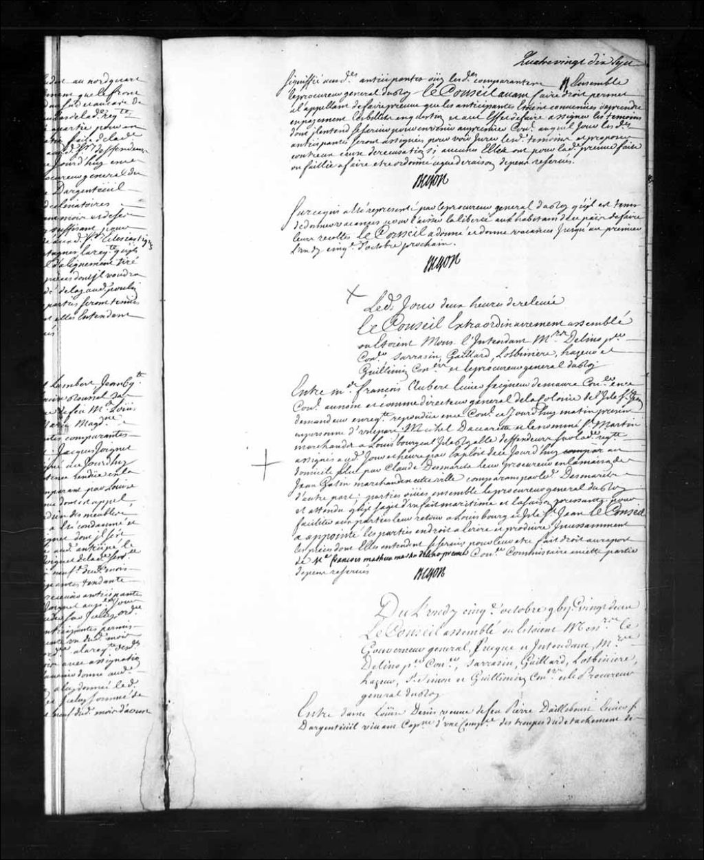 - Arrêt au sujet du bornage et de l'arpentage de la seigneurie des Messieurs de Saint-Sulpice, dans la cause de Louise Denys, veuve de Pierre d'Ailleboust d'Argenteuil, contre les dits Messieurs de Saint-Sulpice, représentés par M. François Vachon de Belmont, supérieur du Séminaire de Saint-Sulpice