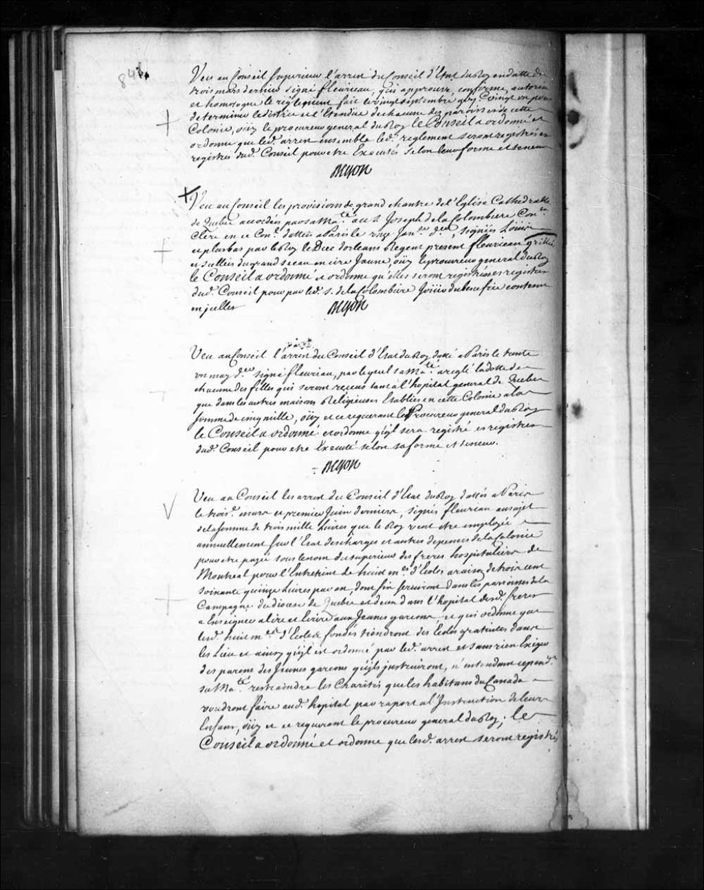 Arrêt qui ordonne d'enregistrer les arrêts du Conseil d'État du Roi, datés à Paris les 3 mars et 1er juin 1722, au sujet de la somme de 3000 livres que le Roi veut employée annuellement sur l'état des charges et autres dépenses de la colonie pour être payée sous le nom du supérieur des Frères Hospitaliers de Montréal pour l'entretien de 8 maîtres d'écoles, à raison de 375 livres par an, dont six serviront dans les paroisses de la campagne et deux dans l'Hôpital des dits Frères, et à enseigner, à lire et écrire aux jeunes garçons, et qui ordonne que les dits huit maîtres d'écoles fondés tiendront des écoles gratuites