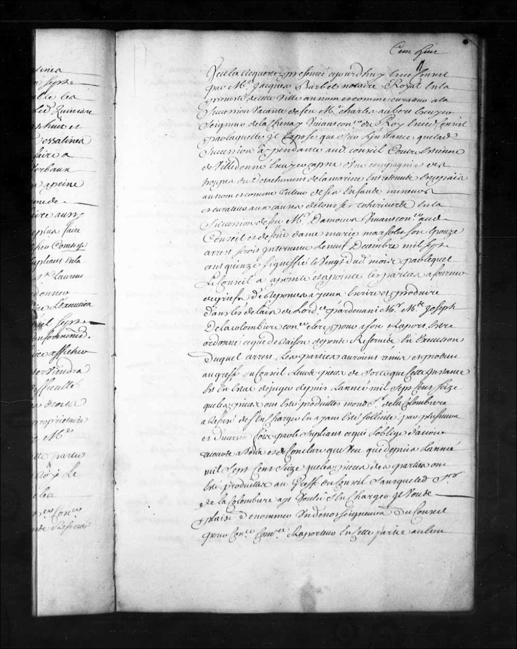 Arrêt qui choisit Charles Macart, conseiller, curateur à la succession vacante de Charles Aubert de la Chesnaye, dans la cause de la dite succession contre Etienne de Villedonné, 9 novembre 1722, Archives nationales à Québec, Fonds Conseil souverain, (03Q,TP1,S28,P15792).