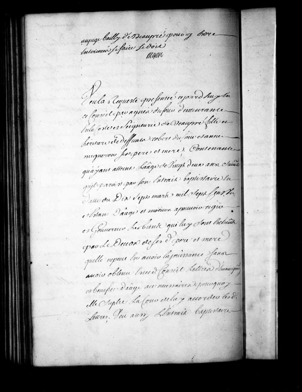 Arrêt qui ordonne d'expédier des lettres de bénéfice d'âge et d'émancipation à Agnès Dufour, née le 17 mars 1701, demeurant en la côte et seigneurie de Beaupré, fille et héritière de défunt Robert Dufour et Anne Migneron, 15 février 1723, Archives nationales à Québec, Fonds Conseil souverain, (03Q,TP1,S28,P15829).
