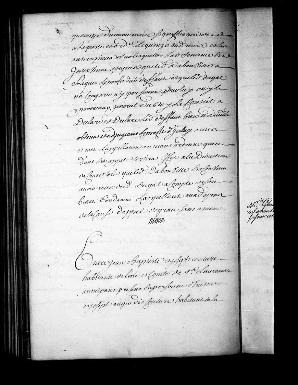 Arrêt qui appointe les parties en droit à écrire et produire dans les délais de l'ordonnance entre les mains de Nicolas Lanoullier, conseiller, dans la cause entre Jean-Baptiste Couture et Joseph Couture, habitants de l'île et comté de Saint-Laurent, et Joseph Oger Couture, habitant de la côte de Lauzon, 15 février 1723, Archives nationales à Québec, Fonds Conseil souverain, (03Q,TP1,S28,P15833).