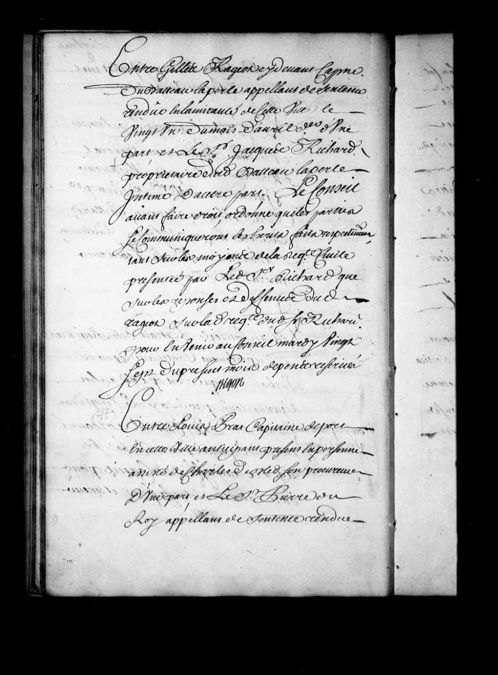 Arrêt qui, avant de faire droit, ordonne que les parties se communiqueront les écrits faits respectivement dans la cause de Gilles Rageot, capitaine du bateau la Perle, contre Jacques Richard, propriétaire du dit bateau, 19 juillet 1723, Archives nationales à Québec, Fonds Conseil souverain, (03Q,TP1,S28,P15884).