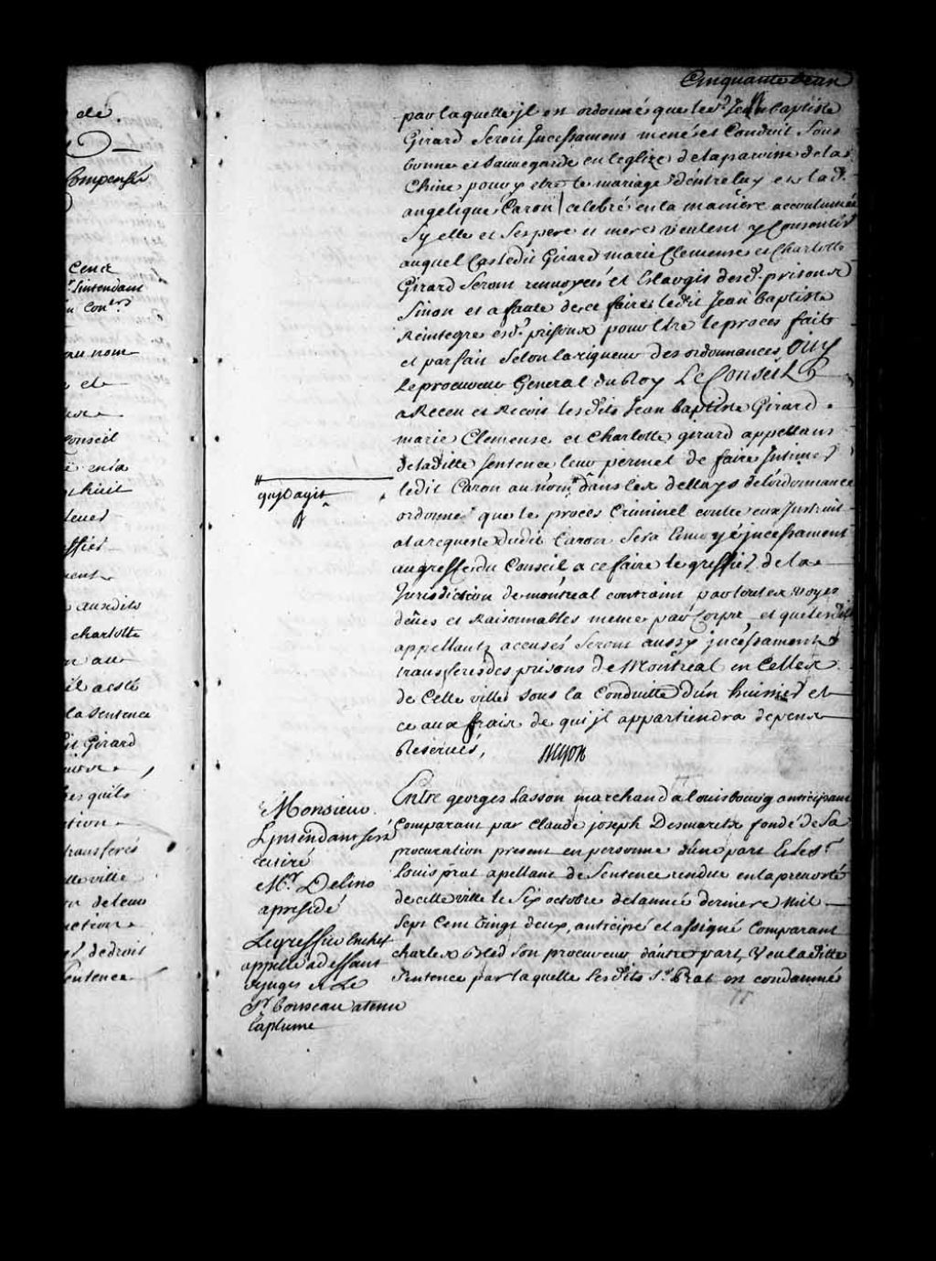 Appel mis à néant d'une sentence rendue en la Prévôté de Québec, le 6 octobre 1722, dans la cause de Georges Lasson, marchand à Louisbourg, contre Louis Prat. Prat est condamné à payer au sieur Desmarest, au nom qu'il agit, la somme de 919 livres, 7 sols contenue en son billet de 1717, 4 octobre 1723, Archives nationales à Québec, Fonds Conseil souverain, (03Q,TP1,S28,P15907).