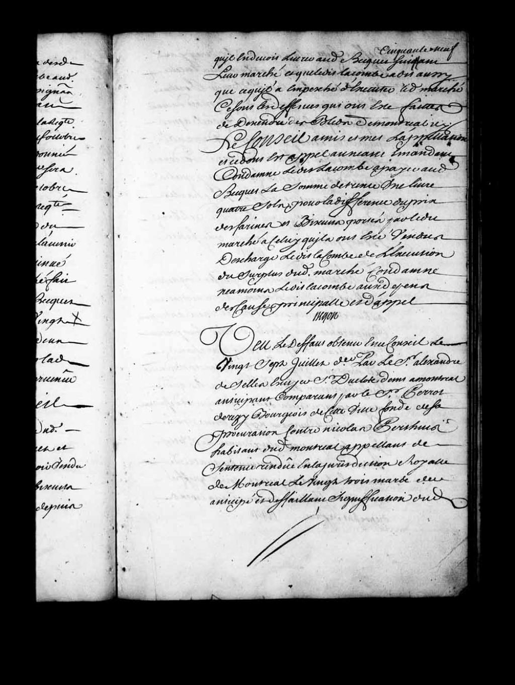 Vu le défaut obtenu en ce Conseil, le 27 juillet 1723, par Alexandre de Selles Duclos contre Nicolas Perthuis, il est ordonné que les pièces des parties seront remises à Charles Guillimin, conseiller, pour en être délibéré le mois prochain, 8 novembre 1723, Archives nationales à Québec, Fonds Conseil souverain, (03Q,TP1,S28,P15914).