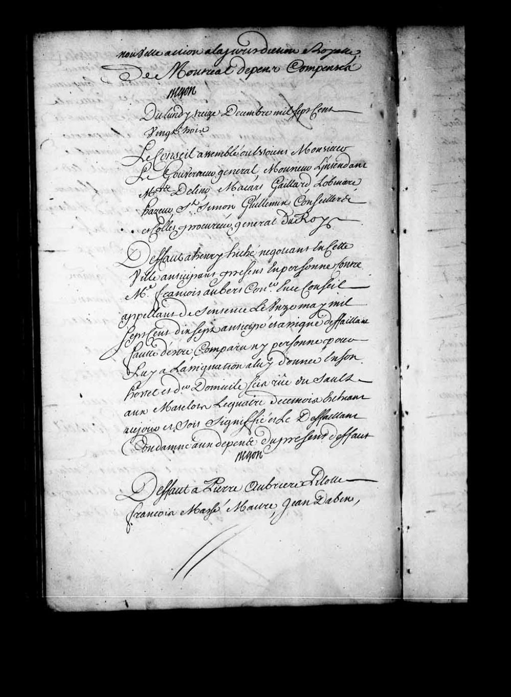 Défaut à Pierre Aubrière, pilote, François Massé, maître, Jean Dabin, maître charpentier, Pierre Robin, maître canonnier, Pierre Dagan, contremaître, et Jean Brosseau et autres, tous de l'équipage du Cheval Marin de Larochelle, contre Antoine Busquet, capitaine du dit navire