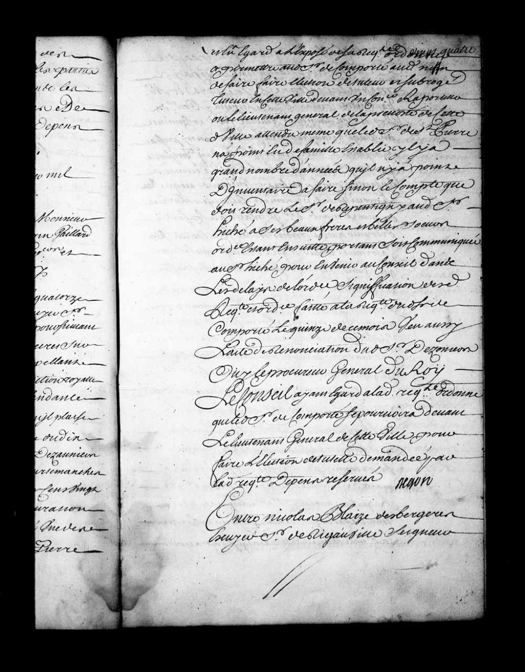 Arrêt qui décide que, dans la cause de Nicolas-Blaise des Bergères de Rigauville contre Jean-Baptiste Couillard de Lespinay, au sujet des bornes des seigneuries de Bellechasse et de la Rivière-du-Sud, le procès-verbal d'arpentage de LeRouge, commencé le 20 juin 1698 et fini le 8 juillet de la même année, sera vérifié par LeBled, arpenteur (nommé par le sieur de Lespinay) et Quentin arpenteur (nommé par le sieur de Rigauville) qui se transporteront immédiatement sur les lieux pour faire le dit arpentage, parties présentes ou dûment appelées, dont ils dresseront procès-verbal pour être rapporté au Conseil