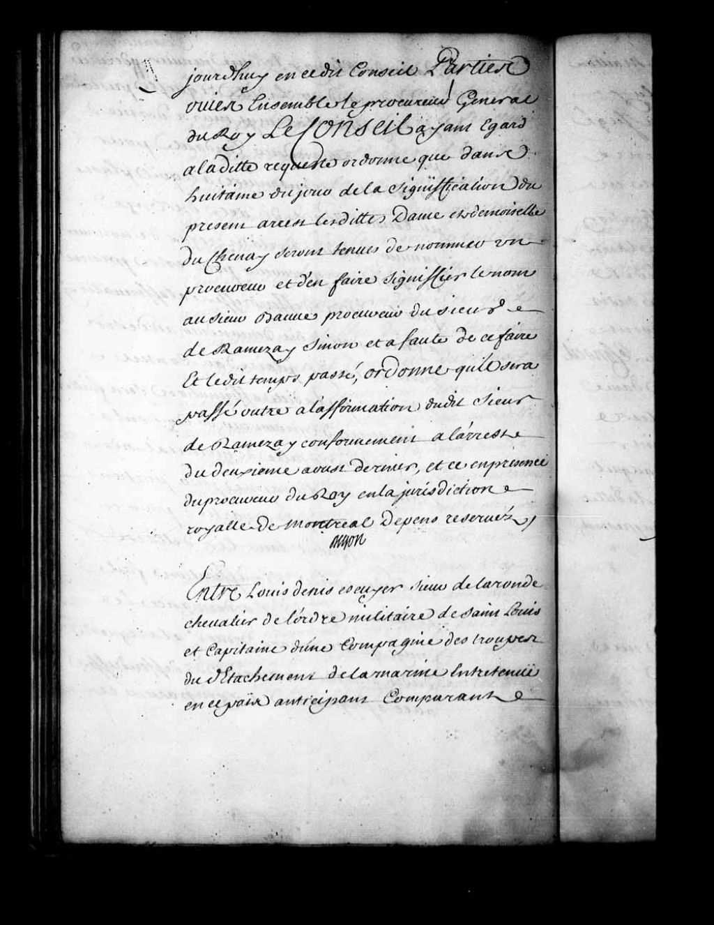 Défaut contre Françoise-Charlotte Juchereau, veuve de François de Laforest, dans sa cause contre Louis Denys de la Ronde. Il est ordonné que les parties seront réassignées pour venir au Conseil lundi prochain, 3 avril 1724, Archives nationales à Québec, Fonds Conseil souverain, (03Q,TP1,S28,P16003).