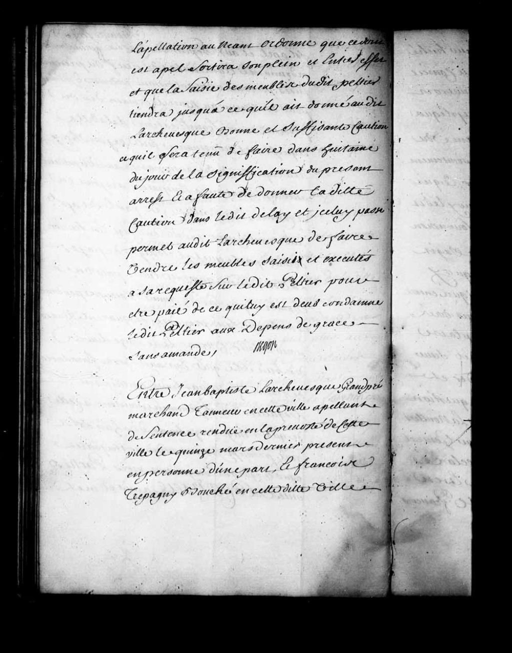 Arrêt qui ordonne de remettre les pièces des parties entre les mains de Charles Guillimin, conseiller, dans la cause de Jean-Baptiste Larchevêque-Grandpré contre François Trépagny, boucher, 10 avril 1724, Archives nationales à Québec, Fonds Conseil souverain, (03Q,TP1,S28,P16007).