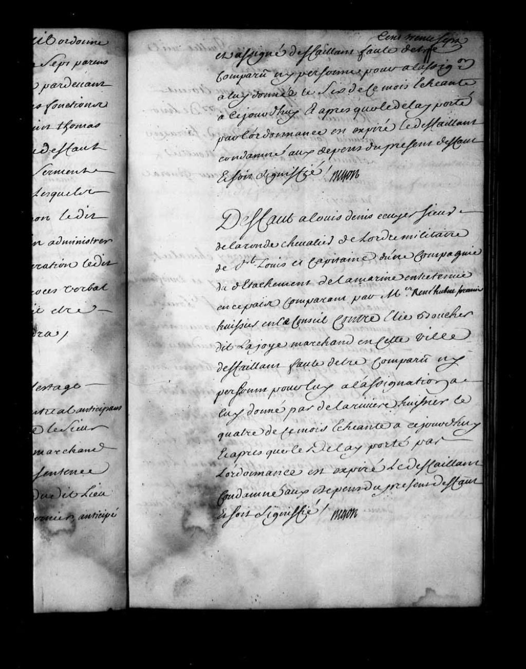 Défaut à Louis Denys de la Ronde, Chevalier de Saint-Louis, capitaine dans les troupes de la Marine, contre Elie Boucher dit Lajoie, marchand à Québec