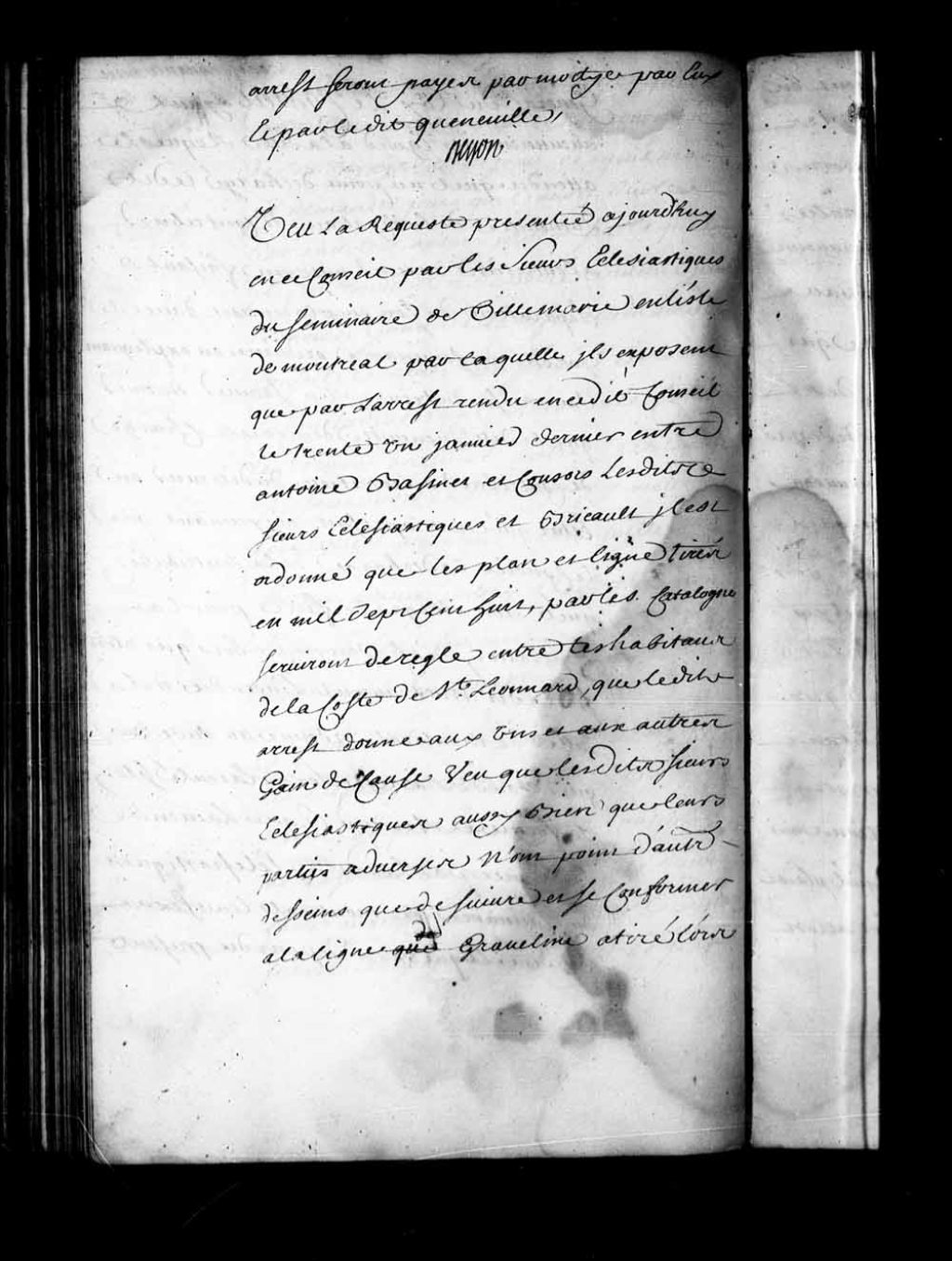 Arrêt qui décide que l'arrêt, du 31 janvier 1724, sera exécuté dans l'affaire entre les Ecclésiastiques du Séminaire de Montréal et Antoine Bazinet et consorts; contestation au sujet des bornes à planter sur la commune de la côte Saint-Léonard