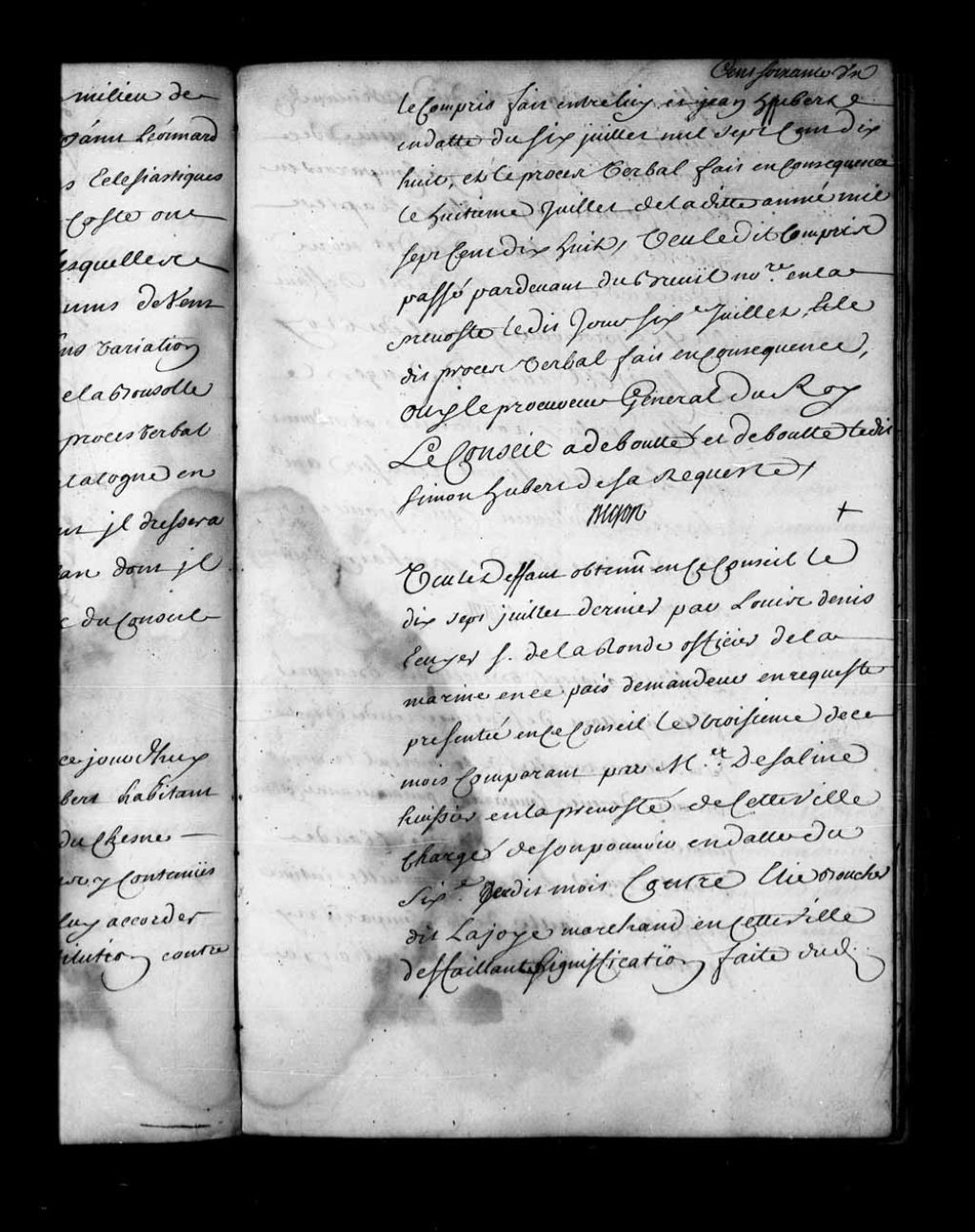 Défaut à Louis Denys de la Ronde contre Elie Boucher dit Lajoie. De plus, arrêt qui ordonne aux parties de remettre leurs pièces entre les mains de Charles Guillimin, conseiller, dans la cause de Louis Denys de la Ronde contre Elie Boucher dit Lajoie, 31 juillet 1724, Archives nationales à Québec, Fonds Conseil souverain, (03Q,TP1,S28,P16055).