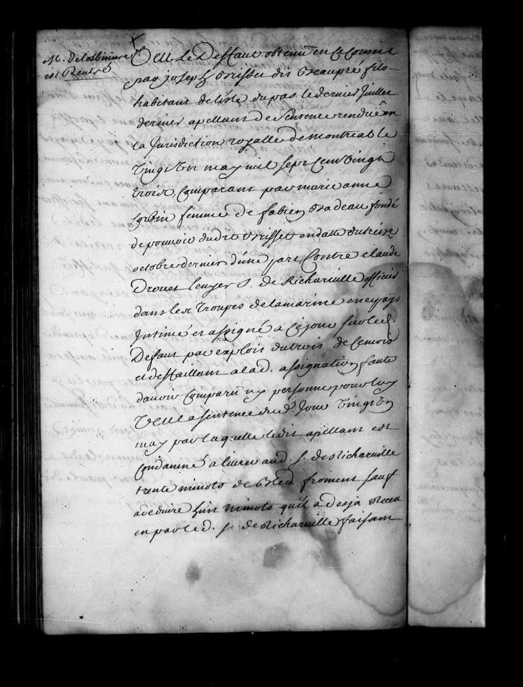 Arrêt qui donne acte de sa demande verbale à Marie-Anne Corbin, comparant pour Joseph Brisset dit Beaupré fils, habitant de l'île Dupas. Le Conseil déclare le défaut bien et dûment obtenu et adjugeant le profit met l'appellation à néant; émendant, condamne le dit Richerville à payer au dit Brisset la somme de 8 livres pour le prix de minots de blé qu'il a reçus de lui à raison de 45 sols le minot
