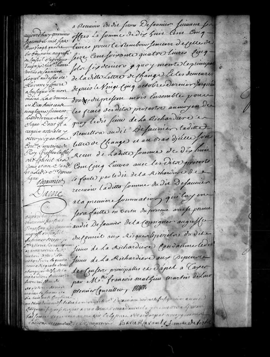 Comparution au greffe du Conseil Supérieur de Marie Hureault, femme de Richard Testu de la Richardière, pour consigner une certaine somme au nom de son mari, 1er juillet 1725, Archives nationales à Québec, Fonds Conseil souverain, (03Q,TP1,S28,P16071).