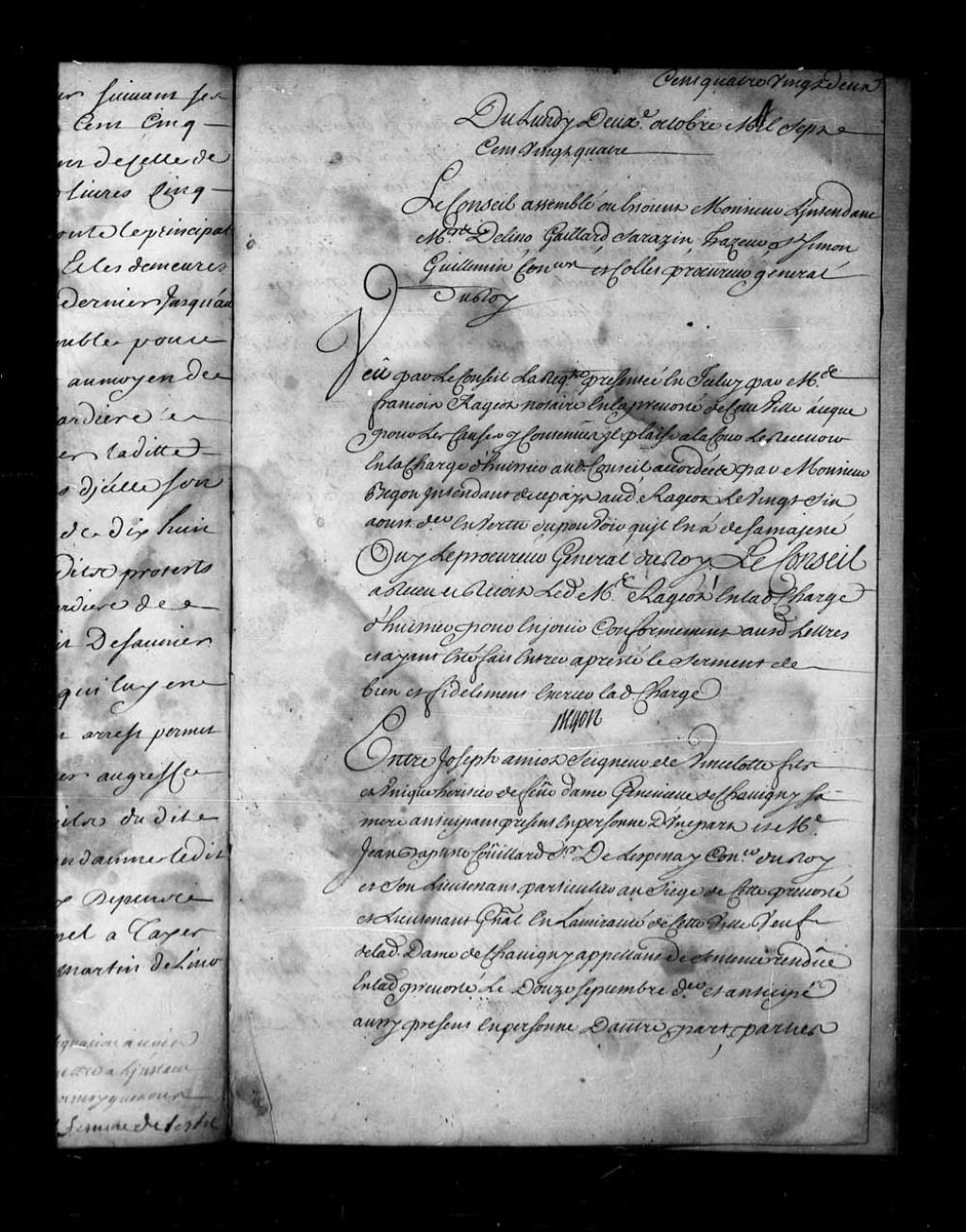 Appel mis à néant de la sentence rendue, le 12 septembre 1724, dans la cause de Joseph Amyot de Vincelotte contre Jean-Baptiste Couillard de Lespinay, 2 octobre 1724, Archives nationales à Québec, Fonds Conseil souverain, (03Q,TP1,S28,P16073).