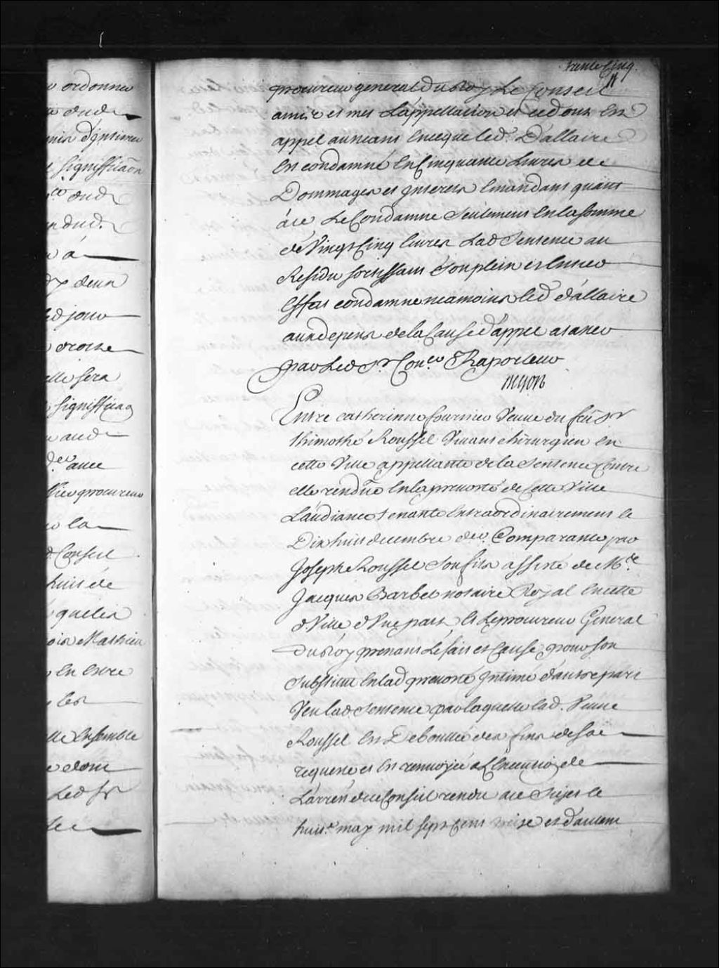 Appel mis à néant de la sentence rendue, le 18 décembre 1724, dans la cause de Catherine Fournier, veuve de Timothée Roussel, contre le procureur général du Roi, au sujet de la vente d'un emplacement et d'une maison à Québec, 15 janvier 1725, Archives nationales à Québec, Fonds Conseil souverain, (03Q,TP1,S28,P16125).
