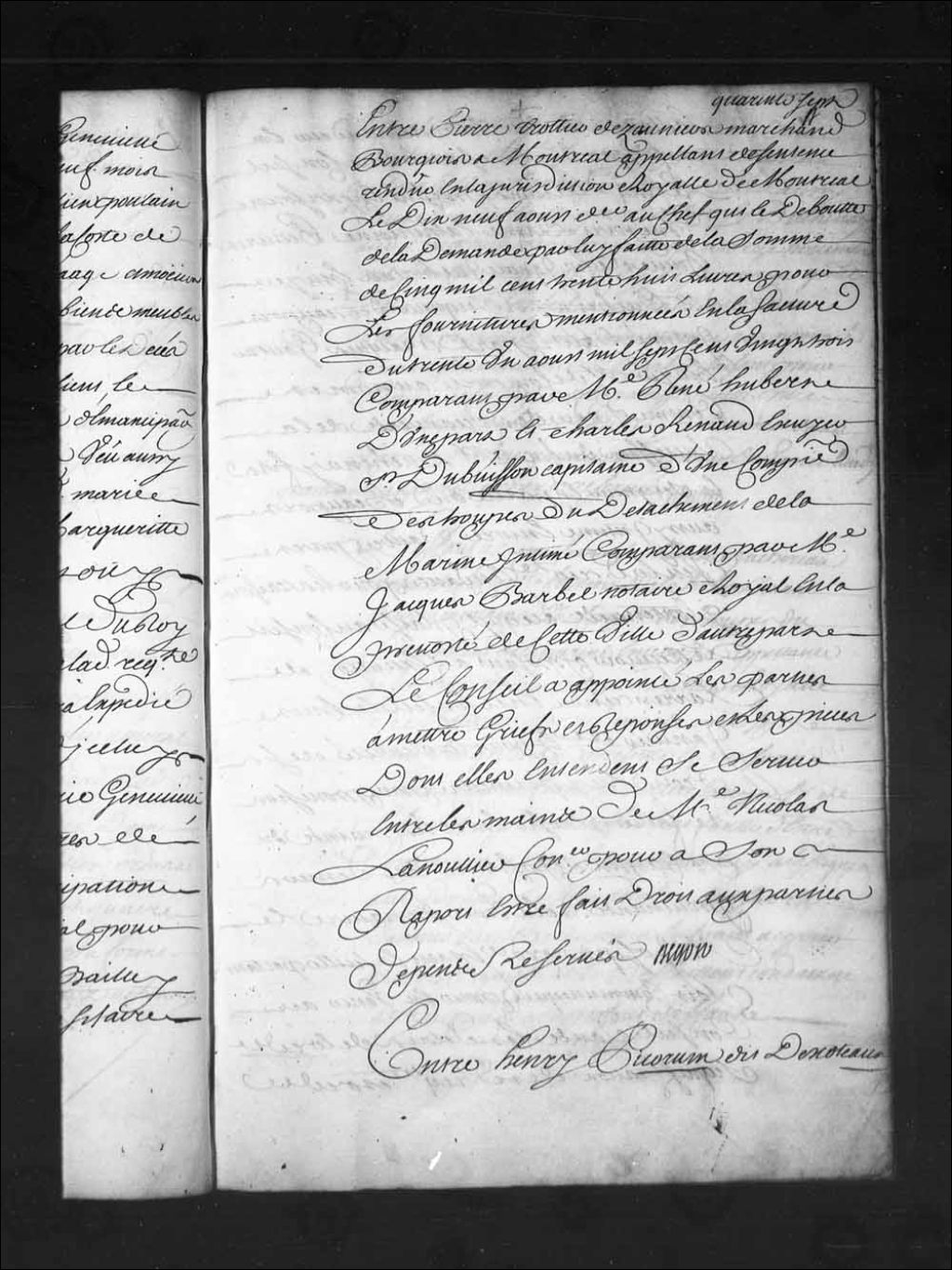 Arrêt qui appointe les parties à mettre griefs et réponses et les pièces dont elles entendent se servir entre les mains de Nicolas Lanoullier, conseiller, dans la cause de Pierre Trottier Desauniers, marchand bourgeois à Montréal, contre Charles Renaud Dubuisson, capitaine dans les troupes du détachement de la Marine