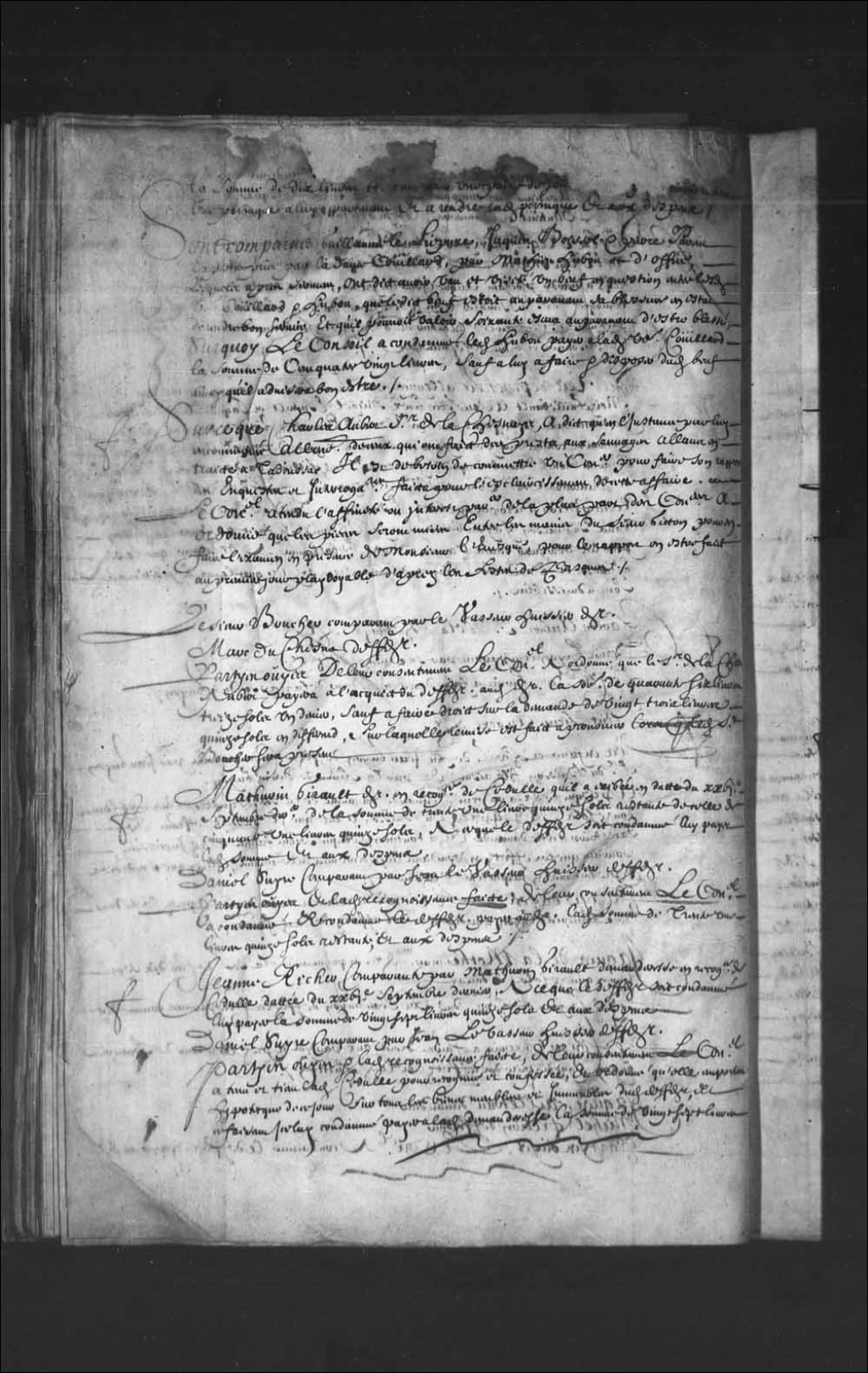 Transcription du texte avec orthographe modernisée : «Jeanne RICHER comparante par Mathurin Girault demanderesse en reconnaissance de cédule datée du 26e septembre dernier, à ce que le défendeur soit condamné lui payer la somme de vingt-sept livres quinze sols et aux dépens. Daniel SUYRE comparant par Jean Levasseur huissier défendeur. Parties ouïes et ladite reconnaissance faite, de leur consentement, le Conseil a tenu et tient ladite cédule pour reconnue et confessée, et ordonné qu'elle emportera hypothèque de ce jour sur tous les biens meubles et immeubles dudit défendeur, et ce faisant icelui condamné payer à ladite demanderesse la somme de vingt-sept livres quinze sols y consentie et aux dépens. AUGUSTIN DE SAFFRAY MESY JUCHEREAU DE LAFERTÉ. RUETTE D'AUTEUIL DAMOURS.»