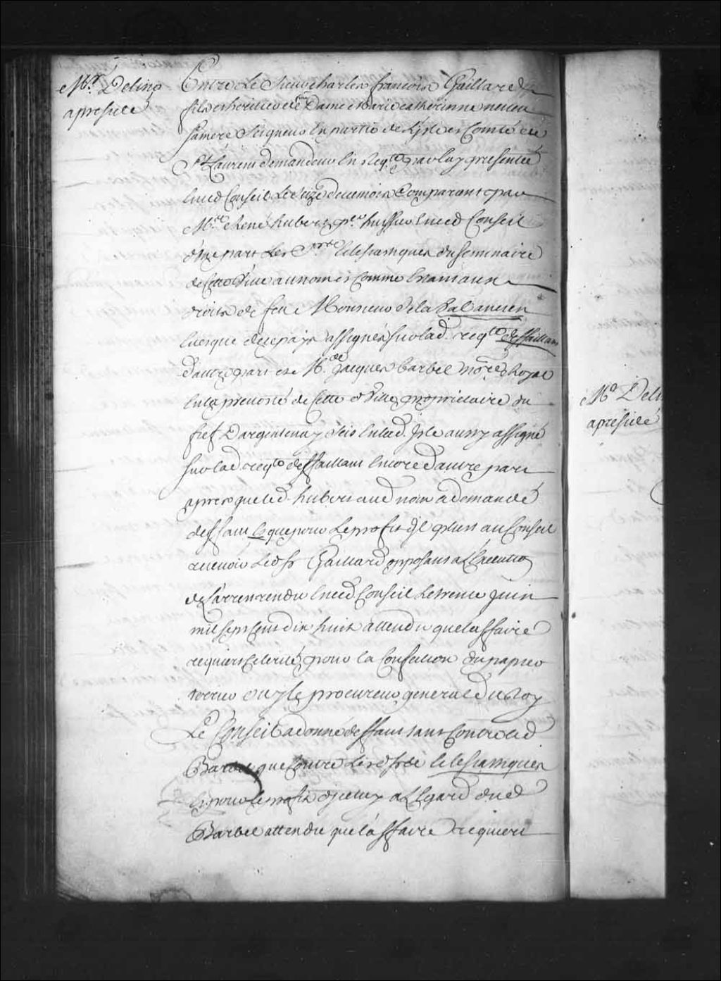 Défaut tant contre Jacques Barbel, notaire, propriétaire du fief d'Argentenay, que contre les Ecclésiastiques du Séminaire de Québec comme étant aux droits de Monseigneur de Laval, dans la cause de Charles-François Gaillard, fils et héritier de feu Marie-Catherine Neveu, sa mère, seigneur en partie de l'île et comté de Saint-Laurent, contre les dits Ecclésiastiques; le dit Charles-François Gaillard reçu opposant à l'exécution de l'arrêt de ce Conseil du 30 juin 1718. Il est ordonné que pour plaider au principal, les parties seront réassignées sur le présent défaut, 30 avril 1725, Archives nationales à Québec, Fonds Conseil souverain, (03Q,TP1,S28,P16172).